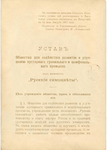 По указу императора Николая II создано Общество для содействия развитию и улучшению кустарного гранильного и шлифовального промысла «Русские самоцветы».