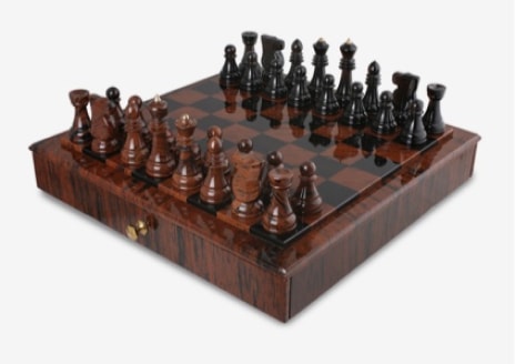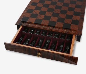 Уникальный комплект шахмат выполнен с филигранными элементами на каменной доске из оникса и обсидиана.