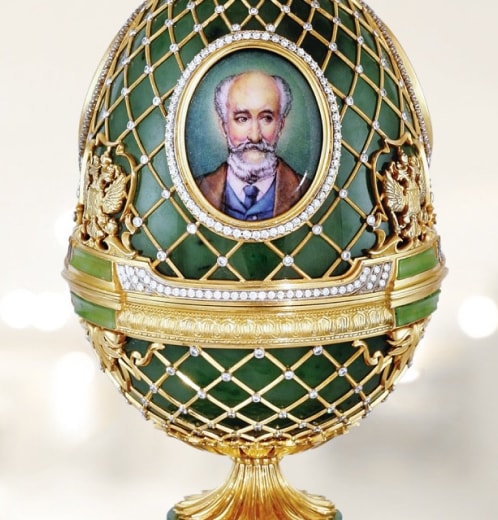 Цвет основного камня искусно оттенен вставками из более светлого нефрита. Накладные золотые орлы образуют густую ажурную сетку, без зазоров прилегающую к скорлупе. Такая сетка была одним из фирменных ювелирных украшений яиц Фаберже. Дополняет яйцо является эмалевая миниатюра с цветным портретом самого Карла Фаберже, выполненная в цветовых тонах всего изделия.