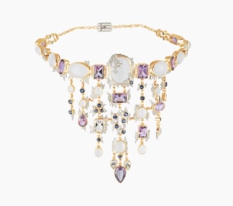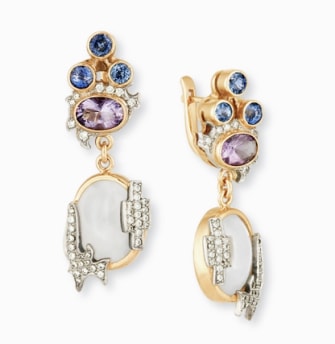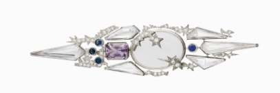 Ювелирные украшения выполнены из белого золота с бриллиантами и танзанитами огранки октагон, груша. Камень уникален тем, что обладает александритовым эффектом и меняет цвет в зависимости от освещения и даже угла обзора. В ближайшее десятилетие, по прогнозам специалистов, месторождение танзанитов может быть исчерпано, что делает камень таким редким.