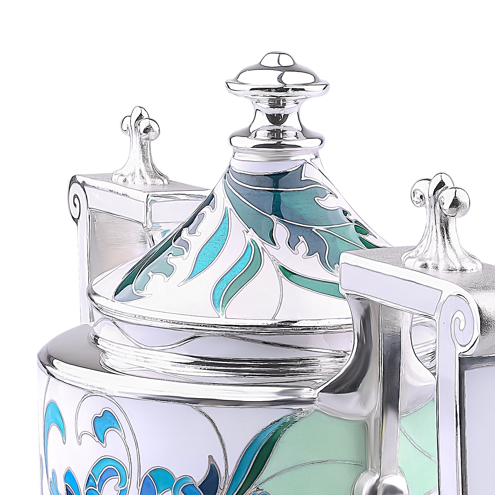Яркий столовый набор, выполненный мастерами Императорского ювелирного дома «РУССКИЕ САМОЦВЕТЫ» из серебра 925 пробы, представляет собой утонченный и элегантный предмет интерьера.