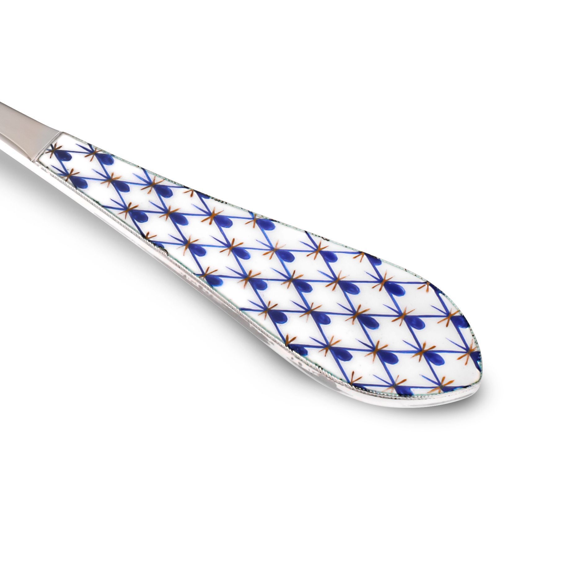 Узоры предметов сервировки стола выполнены по мотивам декора «Собственного сервиза императрицы Елизаветы Петровны». Изделия объединяет решетчатый орнамент, популярный в эпоху стиля рококо. Каждый предмет создан из серебра 925 пробы и вручную расписан эмалью.
