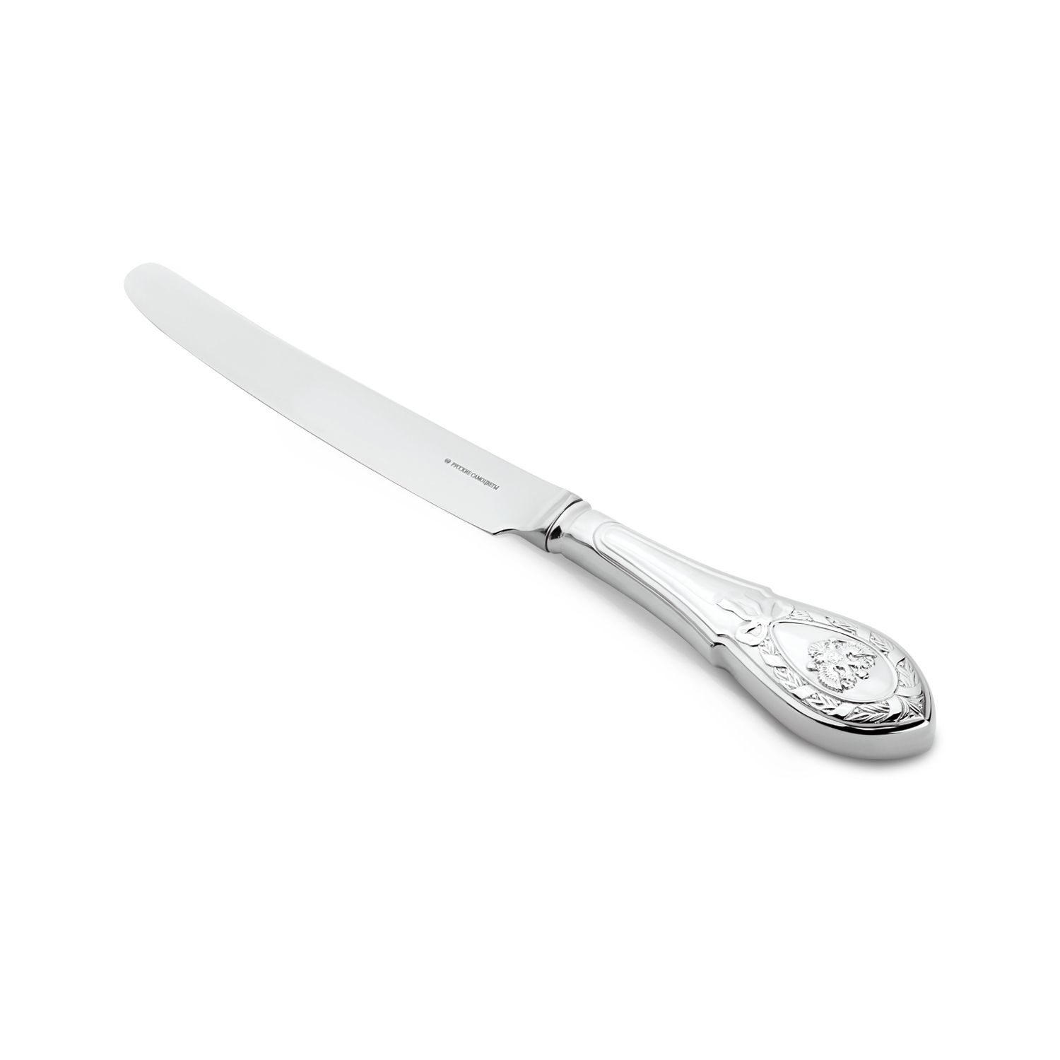 В набор входят предметы сервировки стола на одну персону – столовый нож, ложка и вилка. Изделия выполнены из серебра 925 пробы и декорированы гербом России – знаменитым двуглавым орлом.