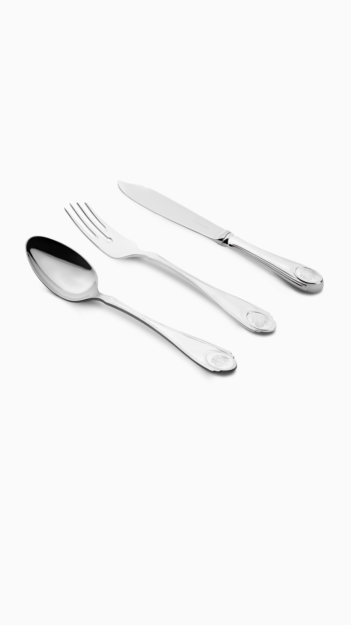 Столовое серебро из набора «Посольский» – это сочетание современных технологий и традиций изготовления драгоценной посуды для императорского двора. На черенке каждого прибора сияет герб России – знаменитый двуглавый орел.