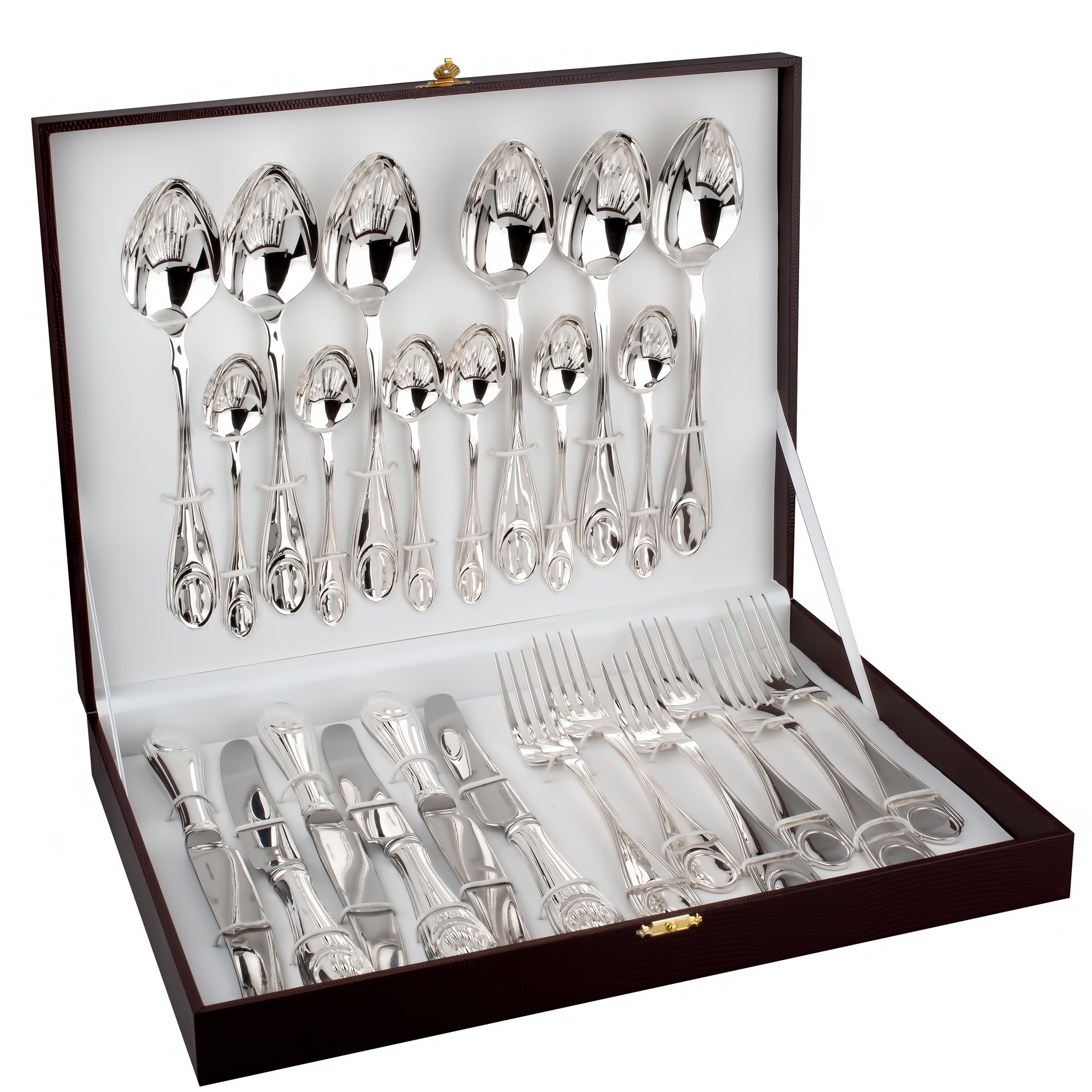 В набор входит 40 предметов сервировки стола, каждый из которых отличается утонченным великолепием. Все изделия имеют свободное овальное окошко, на которое наносится герб или монограмма персоны. Такие наборы столового серебра – настоящая семейная реликвия, которая переходит из поколения в поколение.