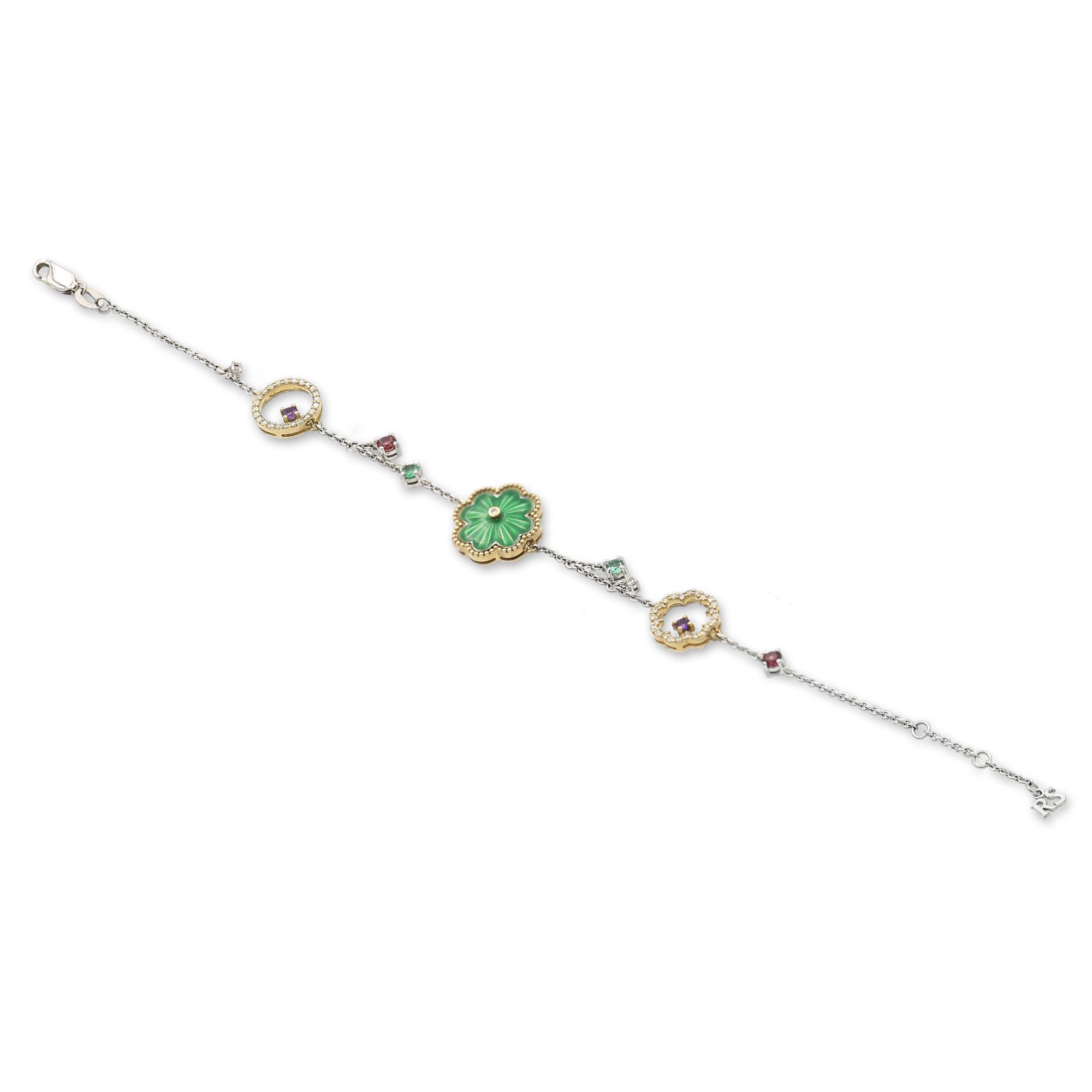 Браслет из белого золота с изумрудами, бриллиантами, альмандинами и аметистами