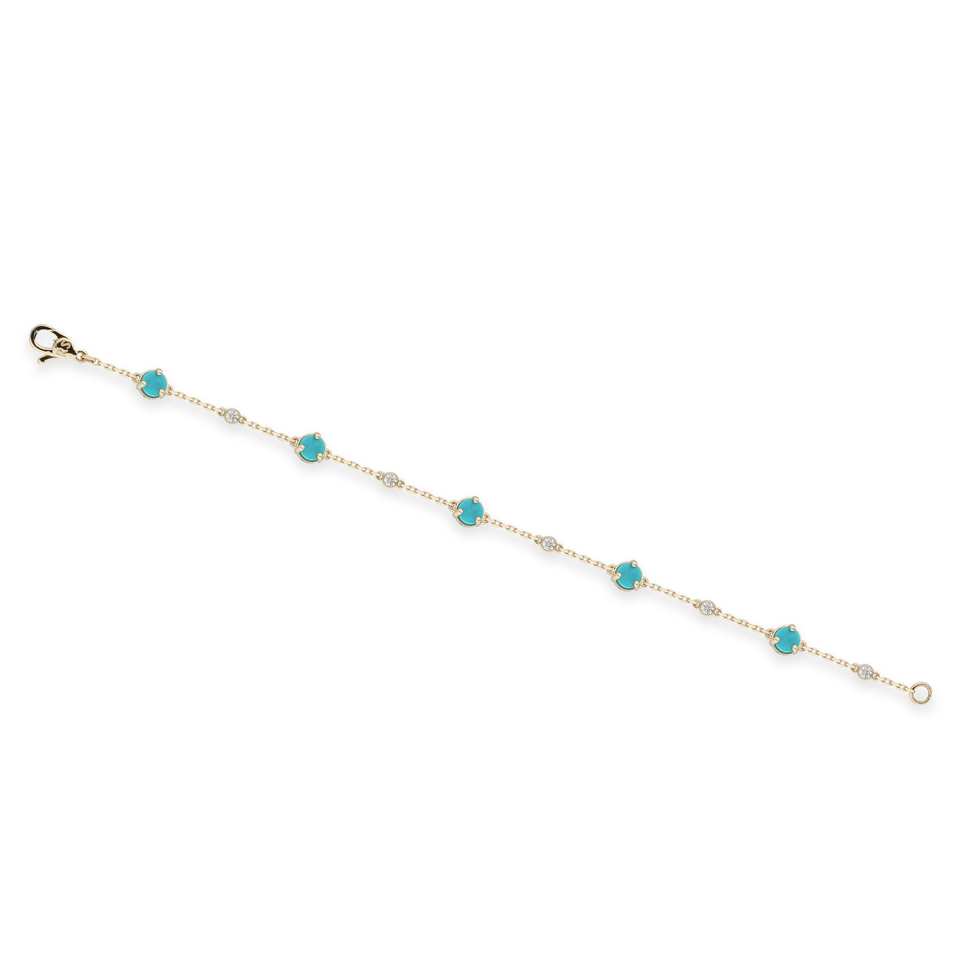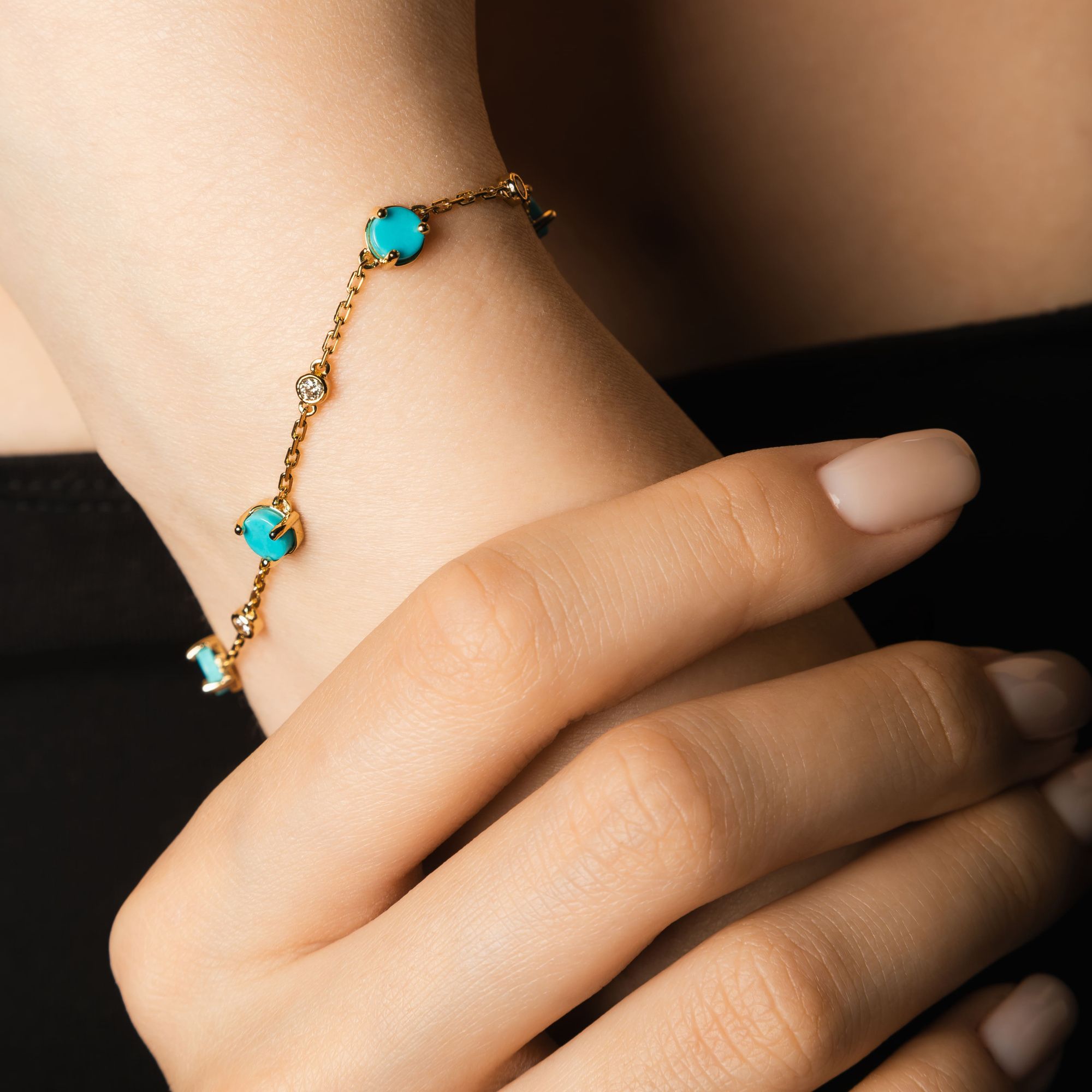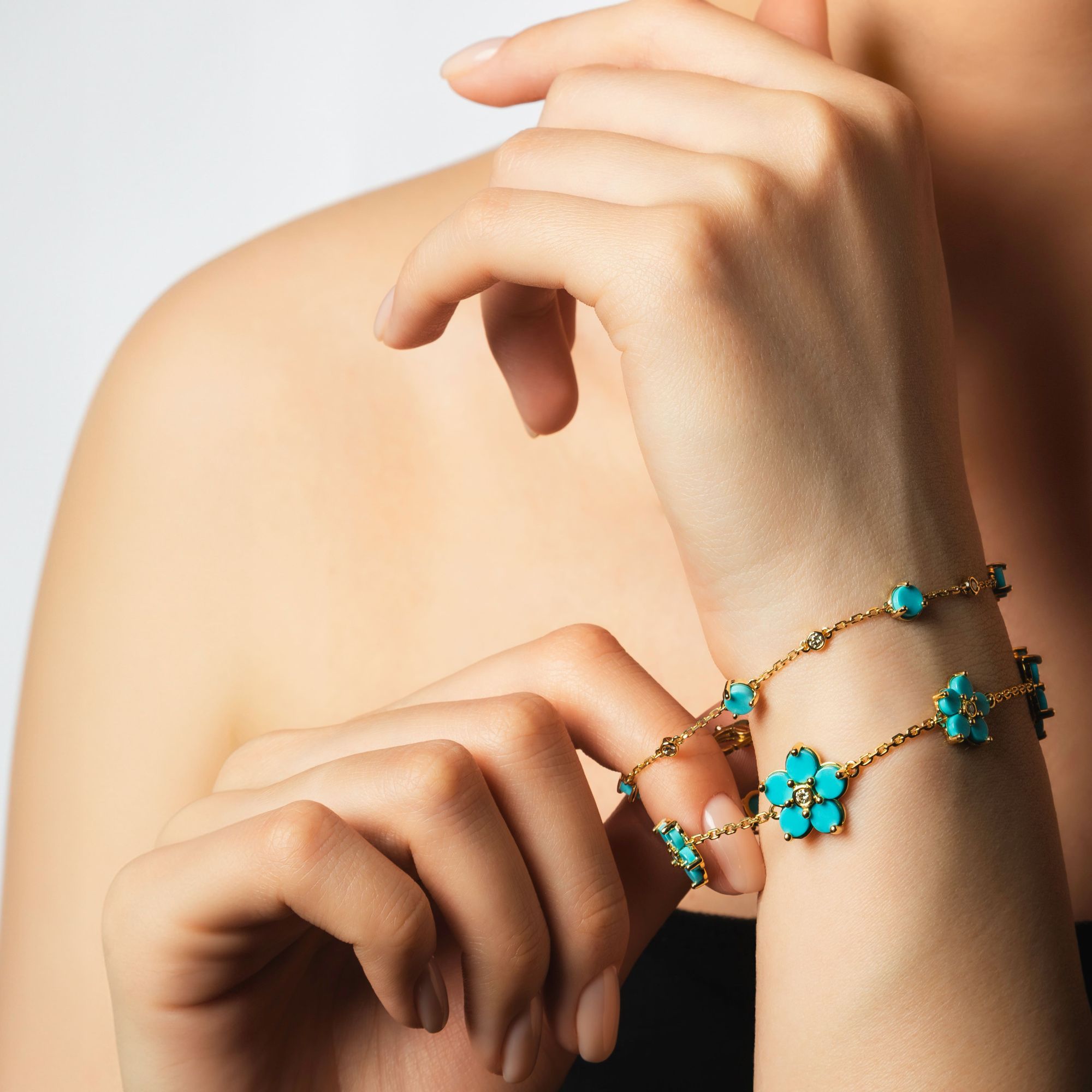 Браслет из желтого золота 585 пробы с бирюзой и бриллиантами - результат соединения мира ботаники и ювелирного искусства. Воплощенное с любовью и тщательным вниманием к деталям, акцентное и неординарное изделие станет идеальным выбором для любителей драгоценных украшений, которые стремятся осуществить свои самые смелые мечты.
