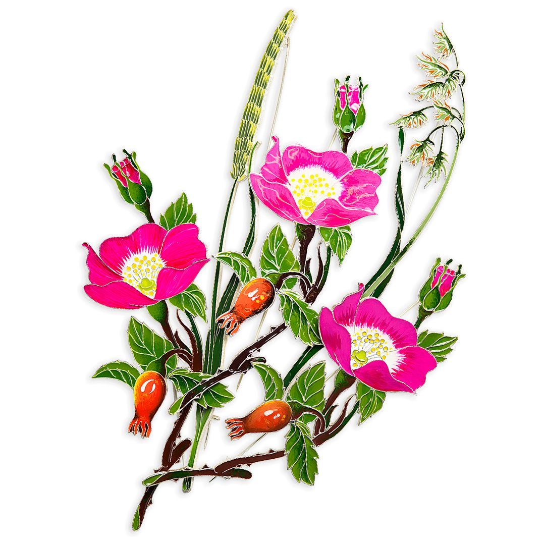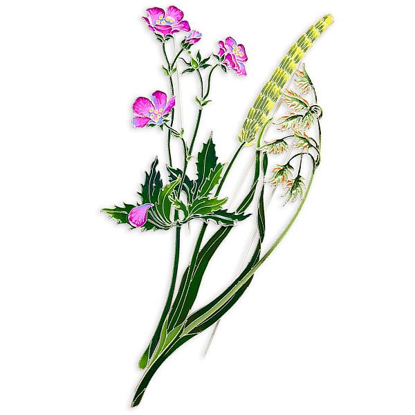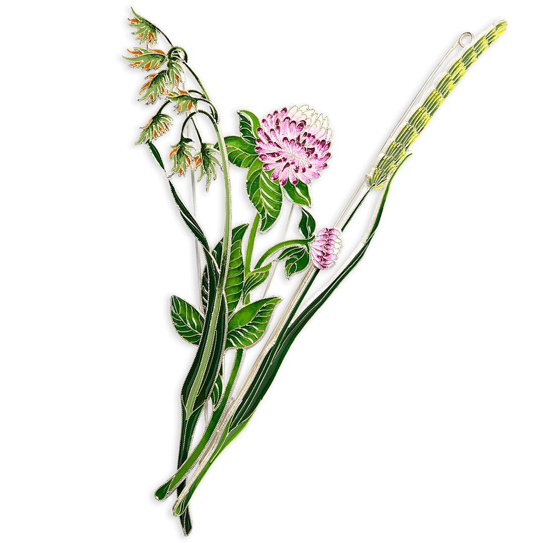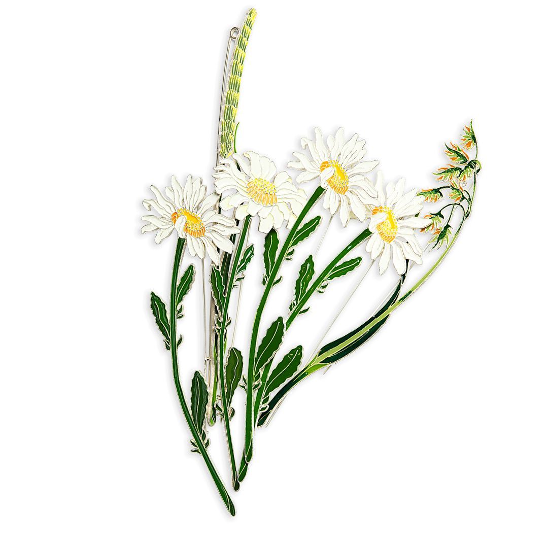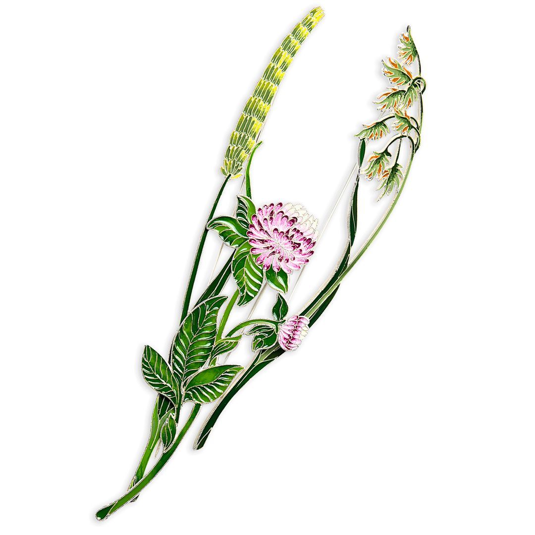 Шелковистые травинки, незаменимые, как воспоминания, я соединяю в букете своих брошей с тимофеевкой, ромашкой, клевером, часиками, полевой гвоздикой, васильками и всегда с высокими кувшинками».