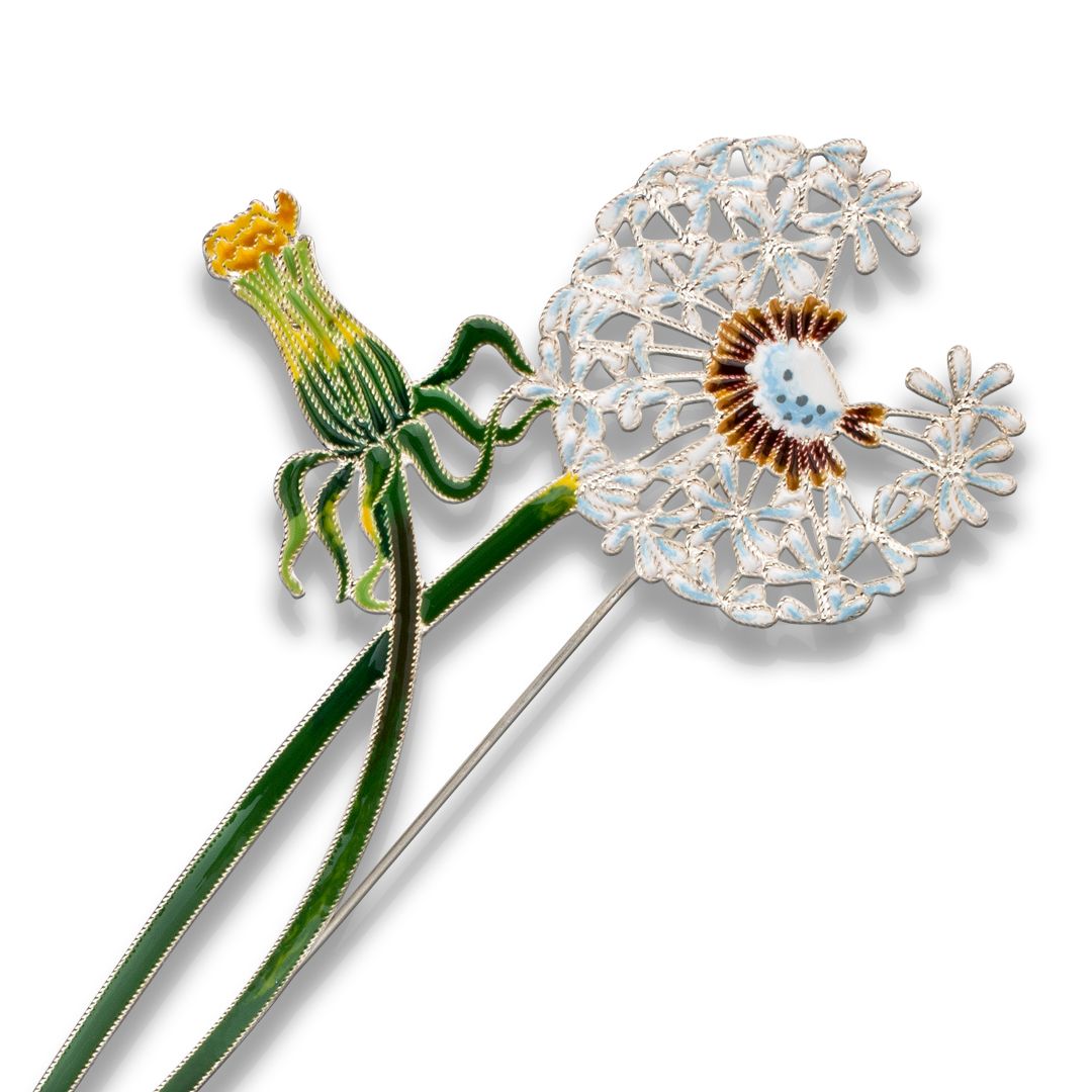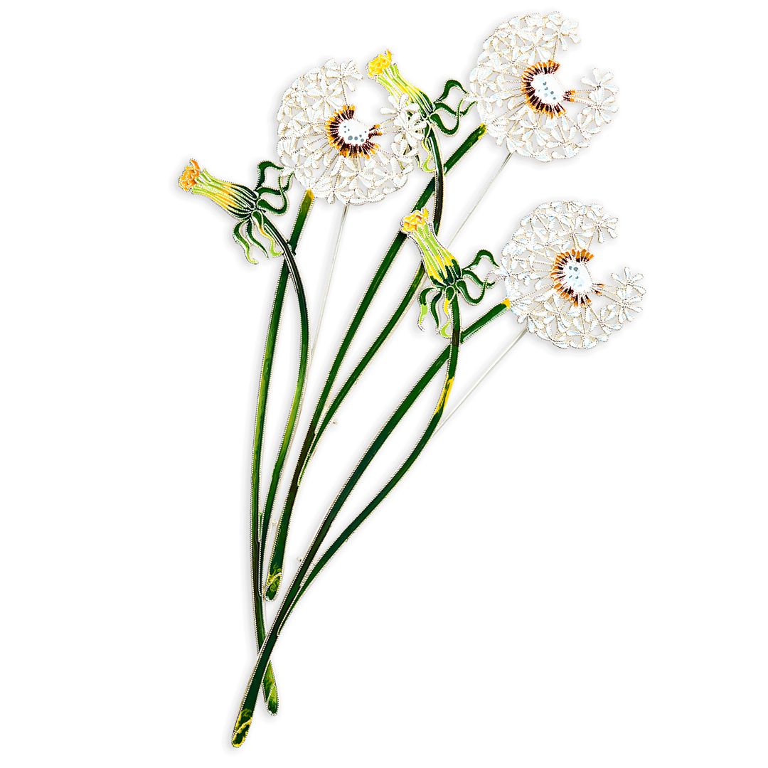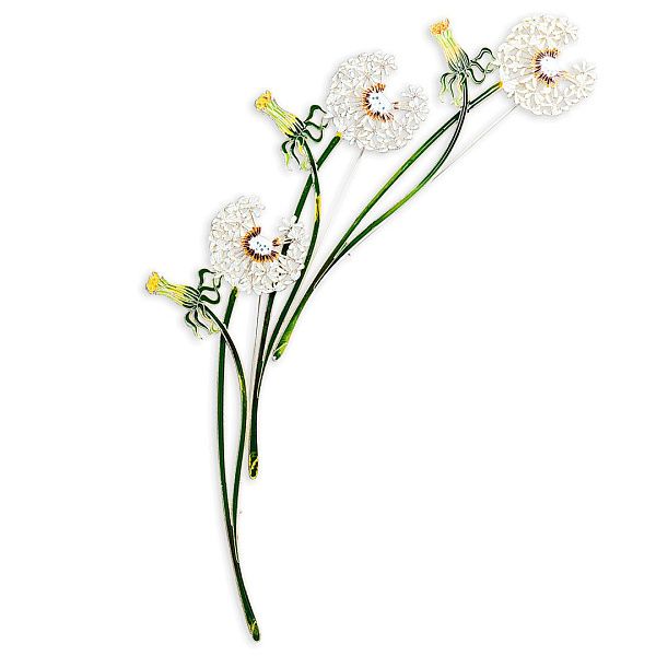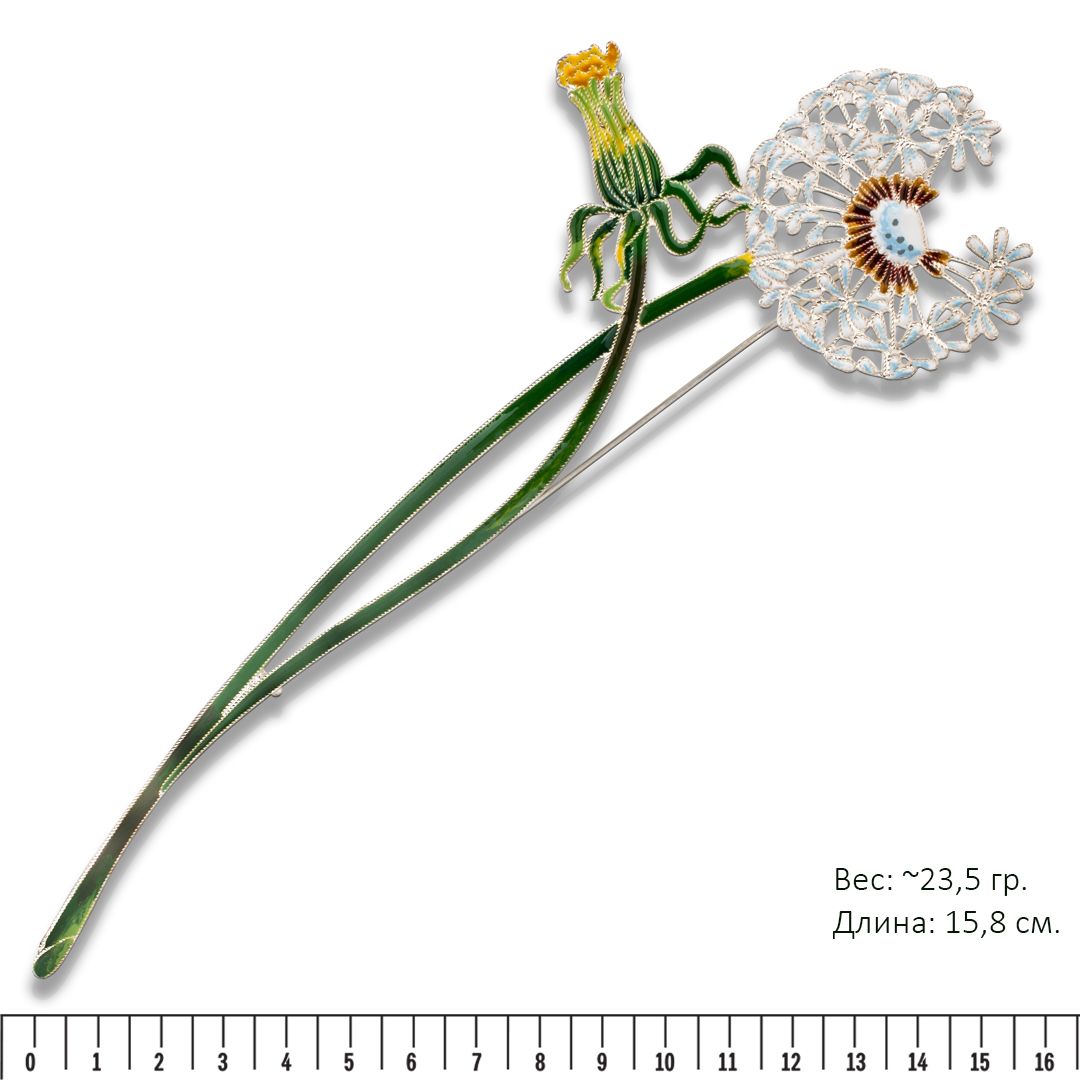 Еще один не терпящий соседей «эгоист», воздушный цвет, эликсир жизни, символ силы солнца и света, цветок верности и любви, яркий и летящий одуванчик. Летящие семена говорят о быстротечности жизни? Отнюдь, мы с ювелирами продлили жизнь легенды, увековечили в серебре жизнь венкам из одуванчика, плывущим по реке или снятым с головы. Семена не разлетятся, венки не завянут. Туч и ненастья не предвидится, нежные желтые лепестки открыты!