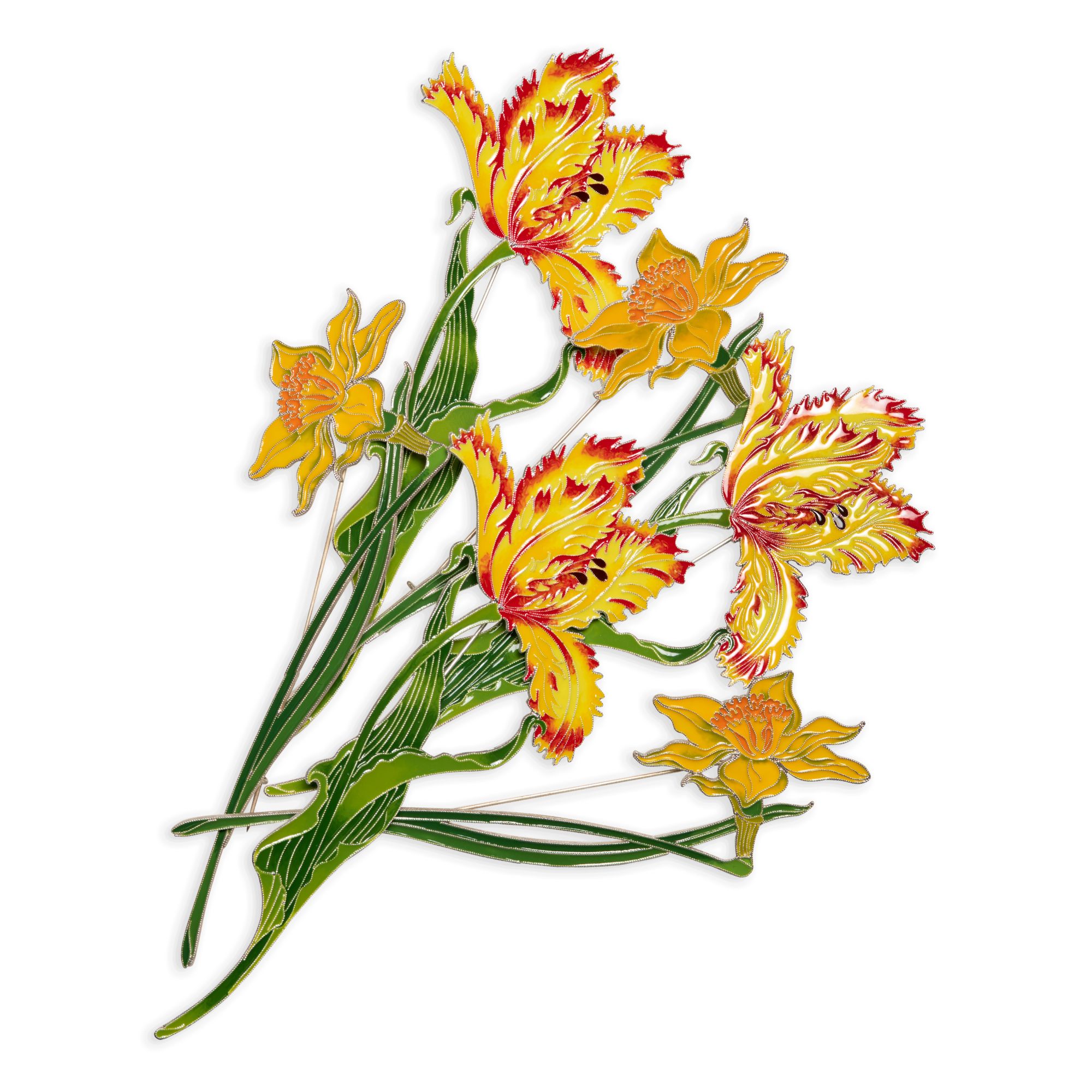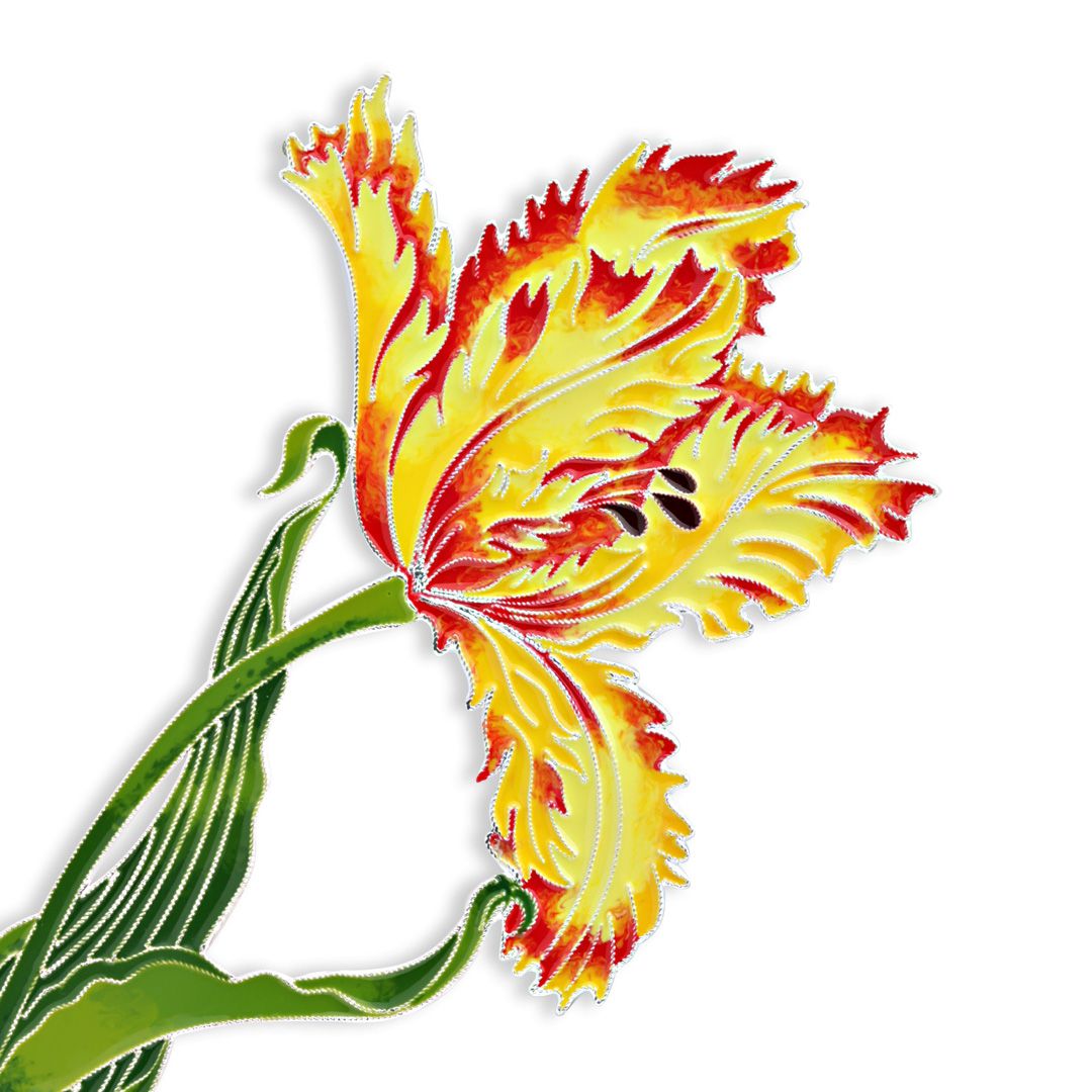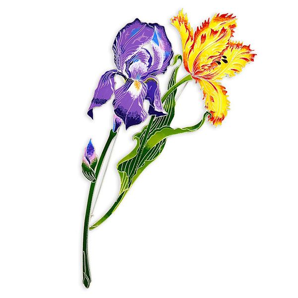Броши "Дворцовый тюльпан" - желтый с красным пламенем и "Елагинский тюльпан" - красный с желтыми перьями - я ношу парой, рядом, раскидистым букетом, а брошь "Елагин" - миниатюрный красный цветок - на лацкане.