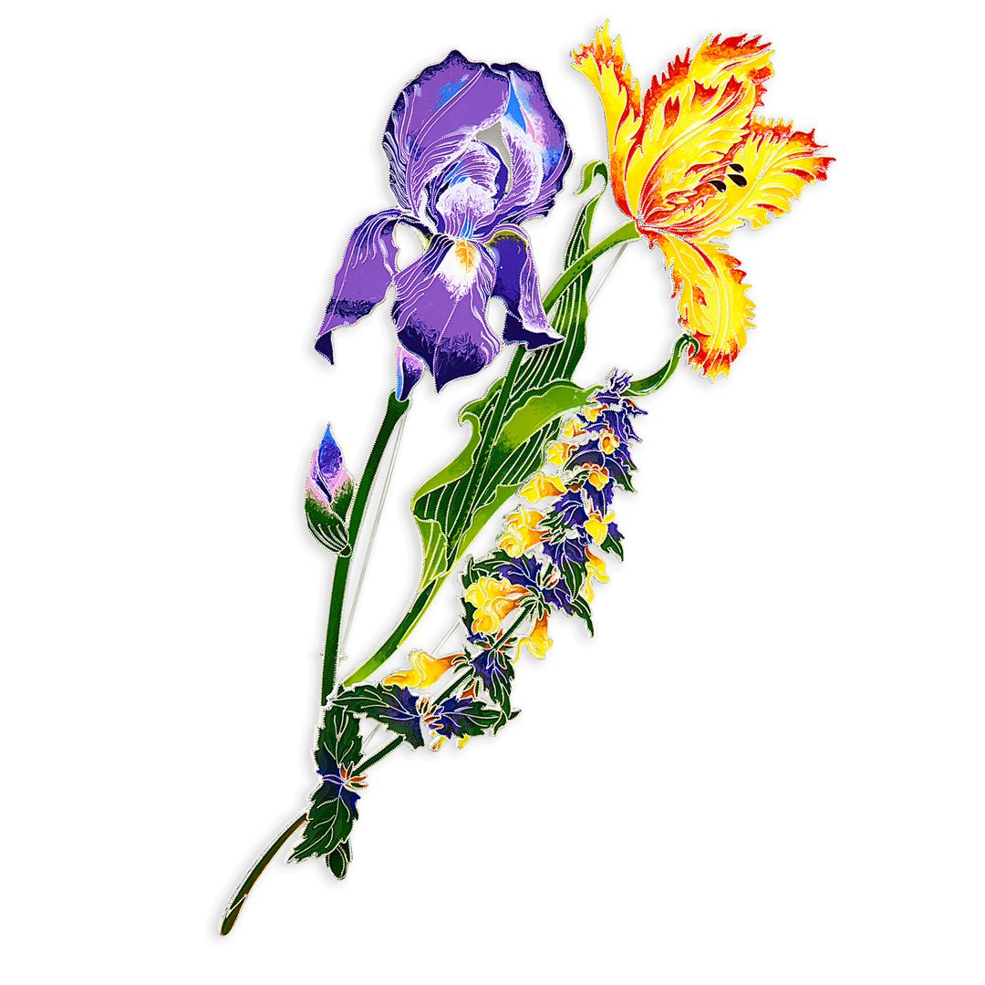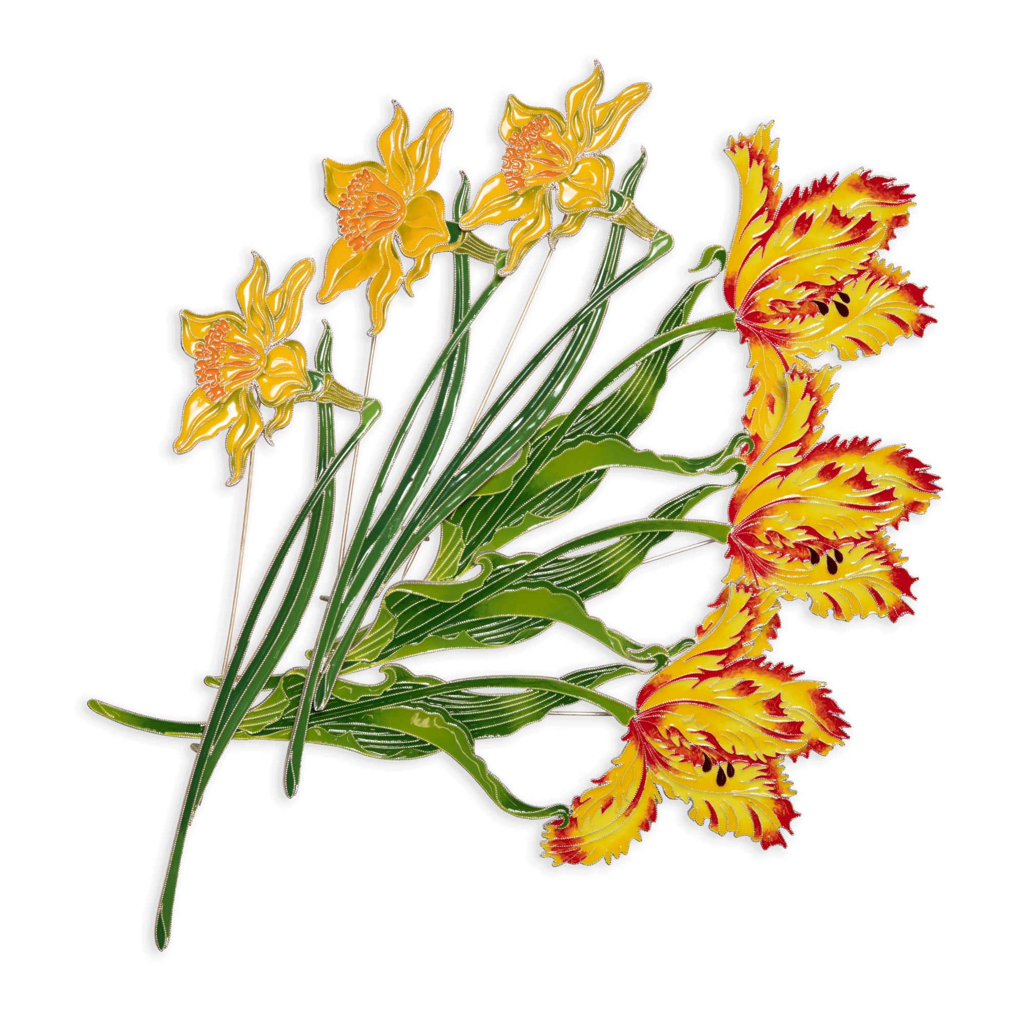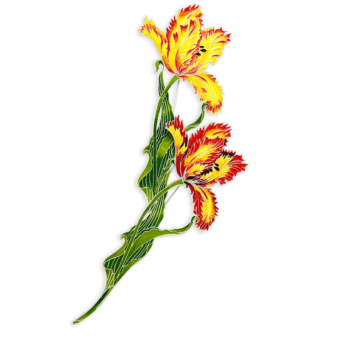 Броши "Дворцовый тюльпан" - желтый с красным пламенем и "Елагинский тюльпан" - красный с желтыми перьями - я ношу парой, рядом, раскидистым букетом, а брошь "Елагин" - миниатюрный красный цветок - на лацкане.