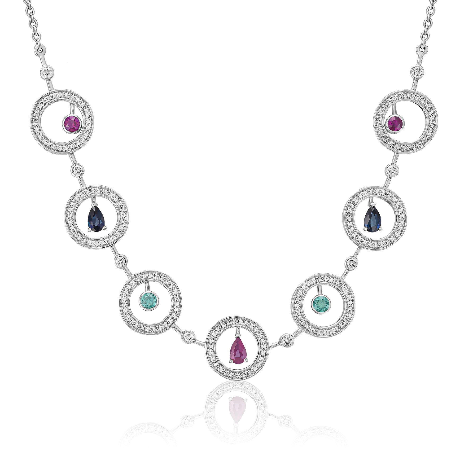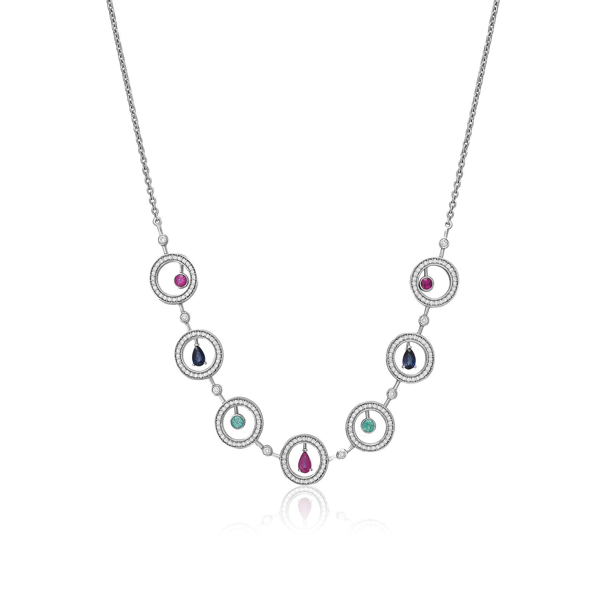 Колье из белого золота с рубинами, бриллиантами, сапфирами и изумрудами