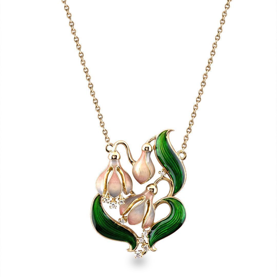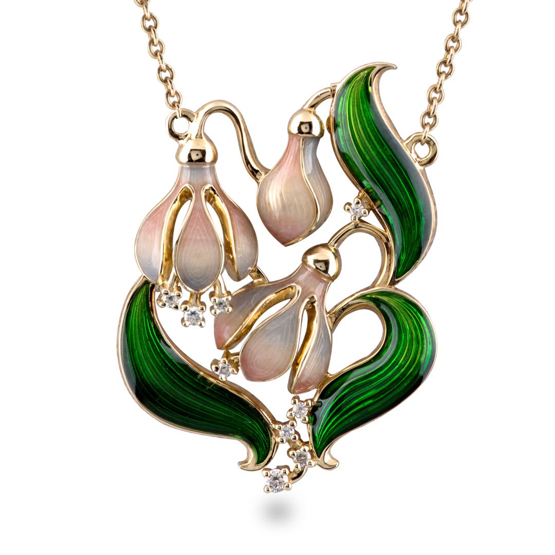 В коллекцию вошли украшения, выполненные в форме подснежников. Нежные и реалистичные оттенки цветам придает гильошированная эмаль – одна из самых эффектных ювелирных техник, которая стала известна благодаря Карлу Фаберже.