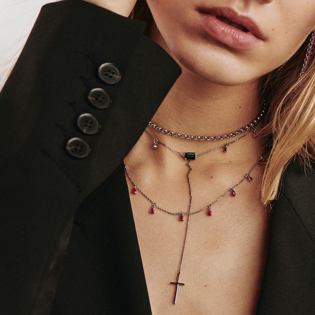 В основу дизайна коллекции NIGHTSHADE легли готические элементы, авторски интерпретированные в современном видении. В украшениях комбинируются белое золото и черные бриллианты, а яркие самоцветы идеально гармонируют между собой и образуют контрастные сочетания. В коллекции прослеживается особая символика, которая воплощена в крестах-подвесках.