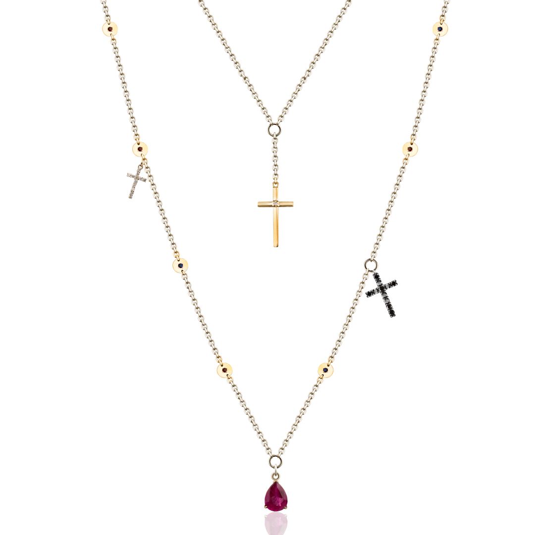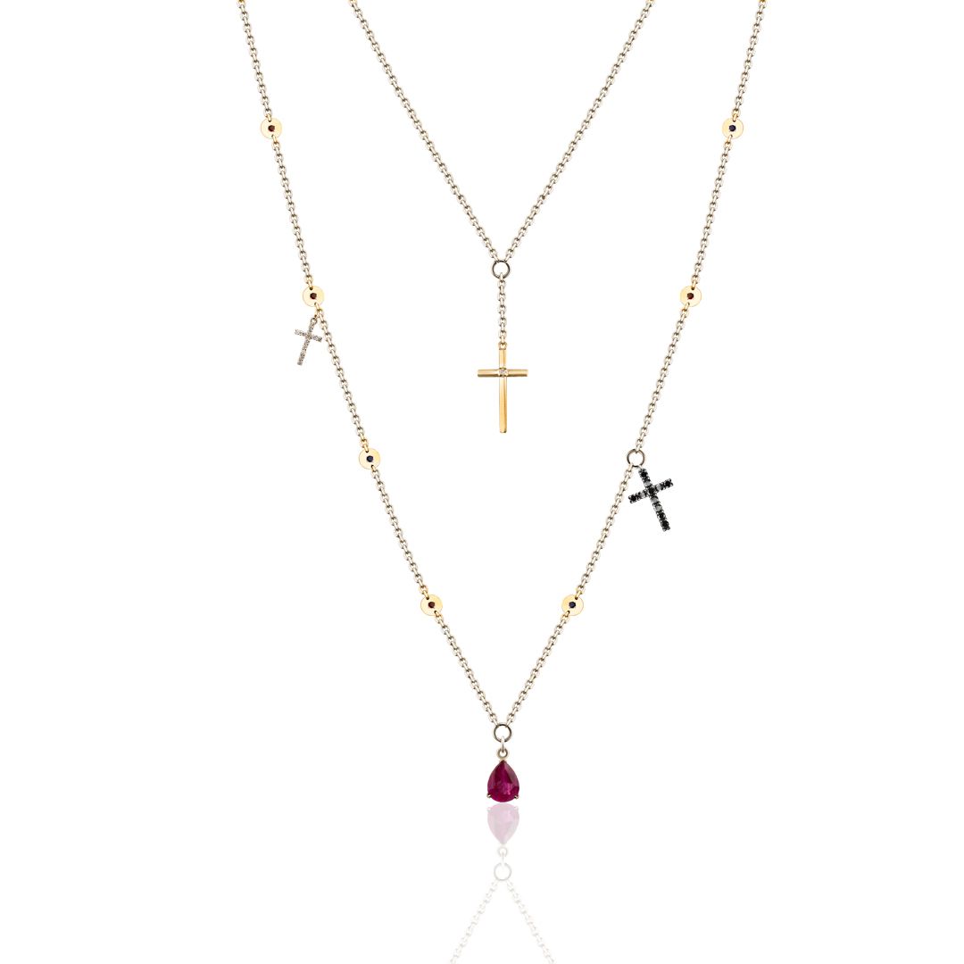 Это колье можно назвать симфонией ночи. Оно восхищает сочетанием белого золота, сверкающих бриллиантов, страстного рубина, ярких топазов и глубоких гранатов. Уникальное сочетание цветов и подвесок в форме крестов создает поистине волшебный образ, наполненный загадочной красотой ночного мира. Каждый камень в этом колье символизирует отдельный аккорд, пробуждающий воображение.