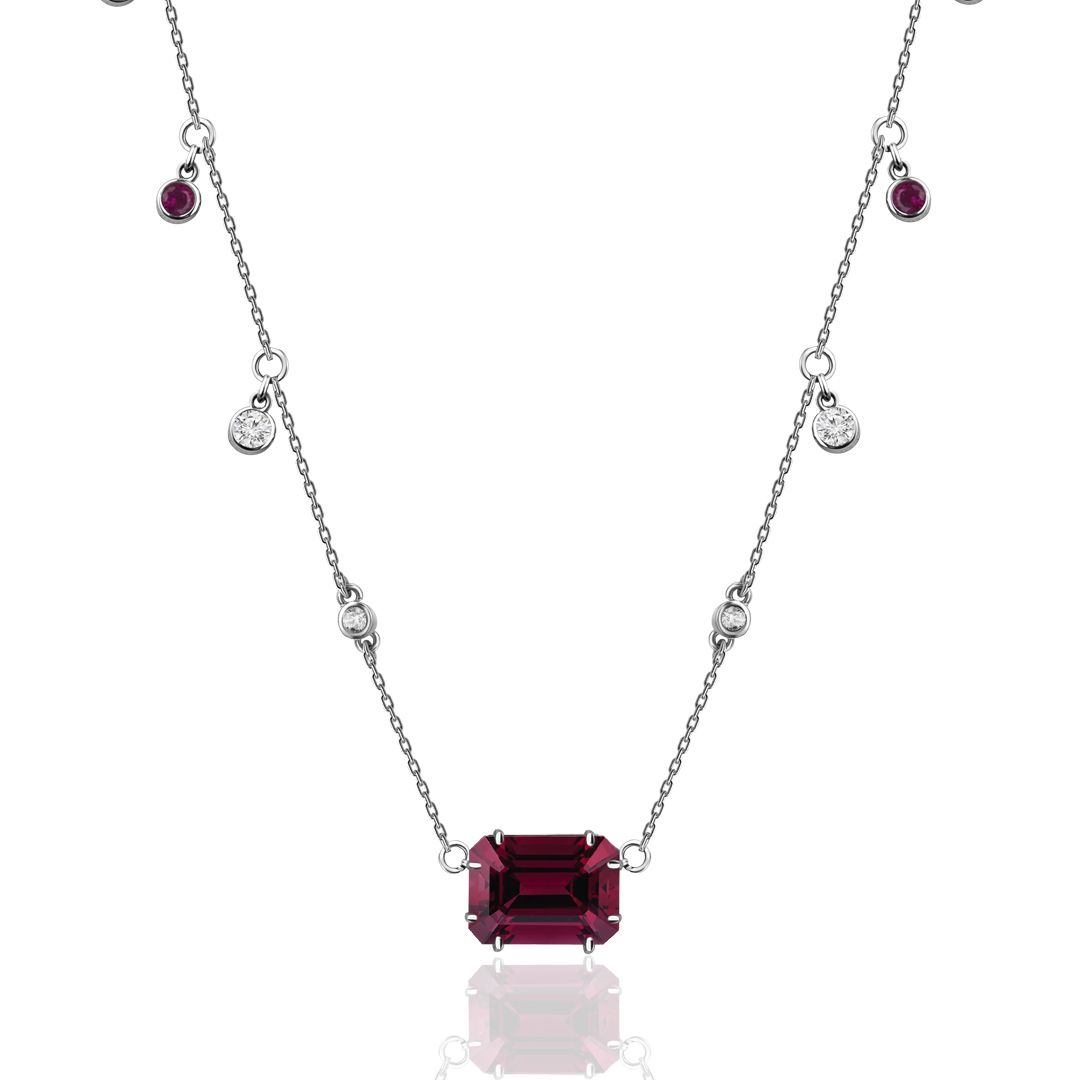 Колье из белого золота с гранатом, рубинами и бриллиантами