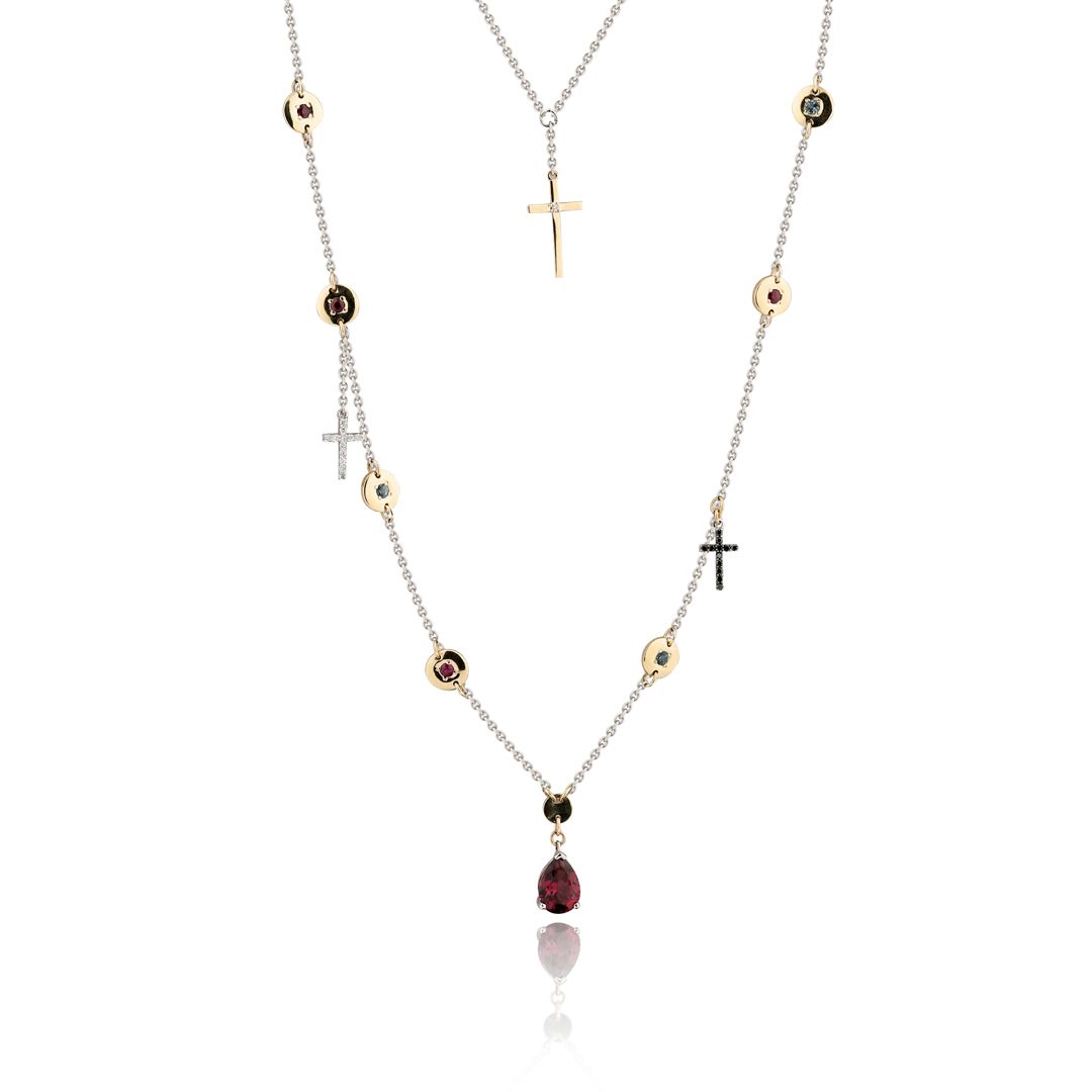 Колье из белого золота с топазами, рубинами, бриллиантами и родолитом