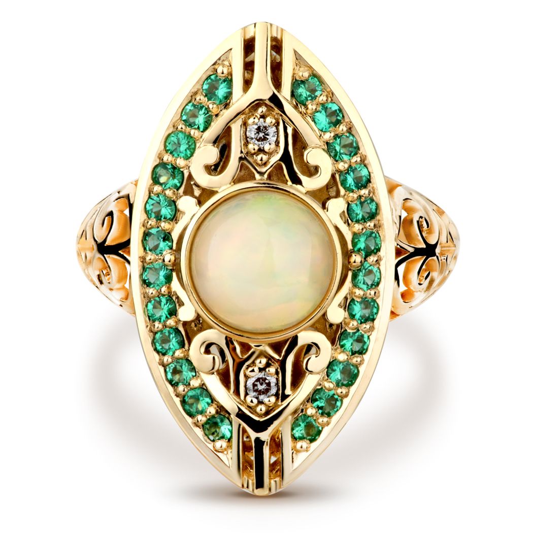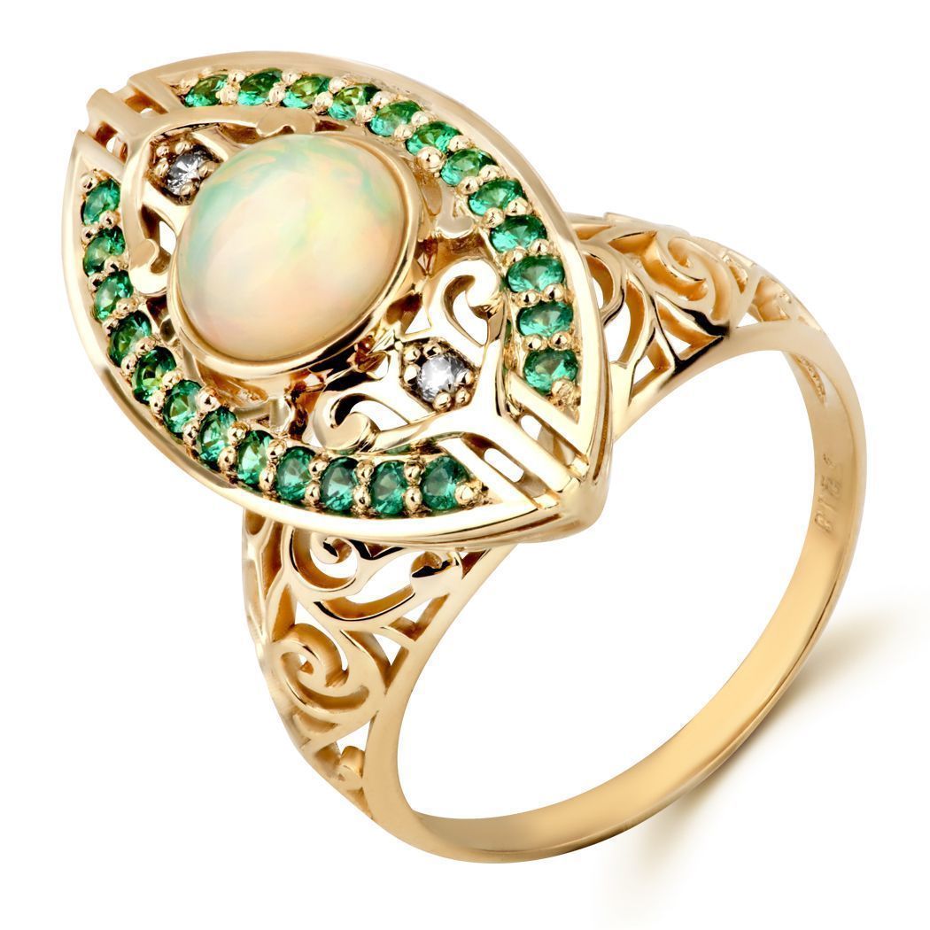 Кольцо «Килиманджаро» из желтого золота с изумрудами, опалом и бриллиантами