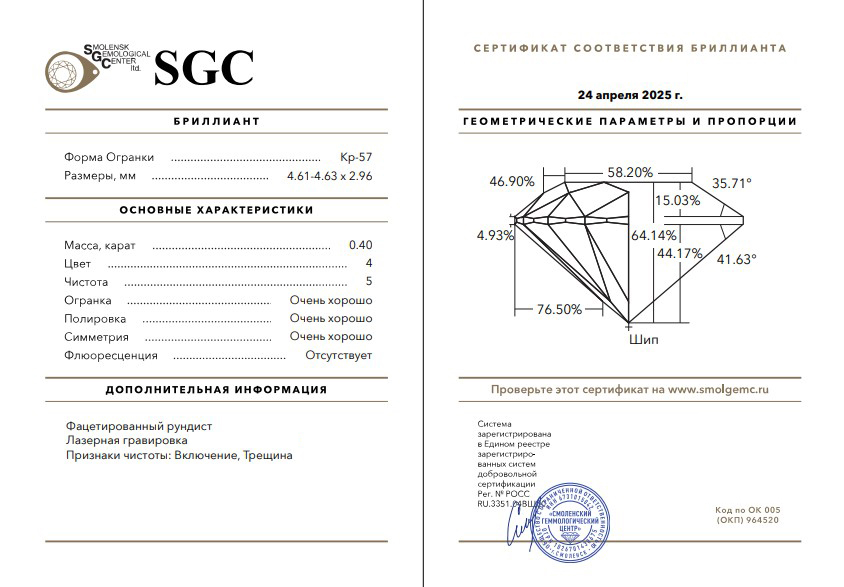 Цвет: 4 , Чистота: 5 Вес: 0.400 ct.