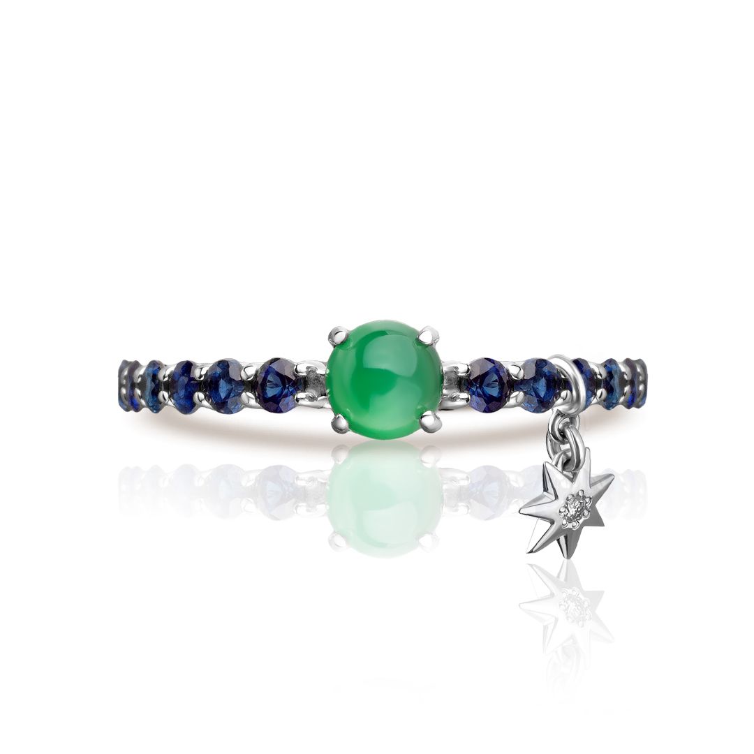 Кольцо из белого золота с сапфирами, бриллиантом и хризопразом