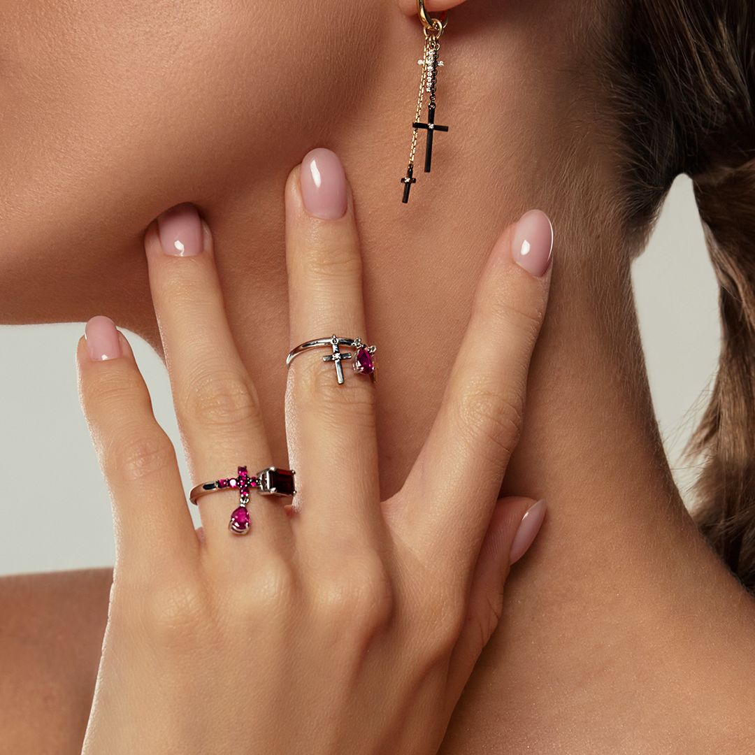 В основу дизайна коллекции NIGHTSHADE легли готические элементы, авторски интерпретированные в современном видении. В украшениях комбинируются белое золото и черные бриллианты, а яркие самоцветы идеально гармонируют между собой и образуют контрастные сочетания. В коллекции прослеживается особая символика, которая воплощена в крестах-подвесках.