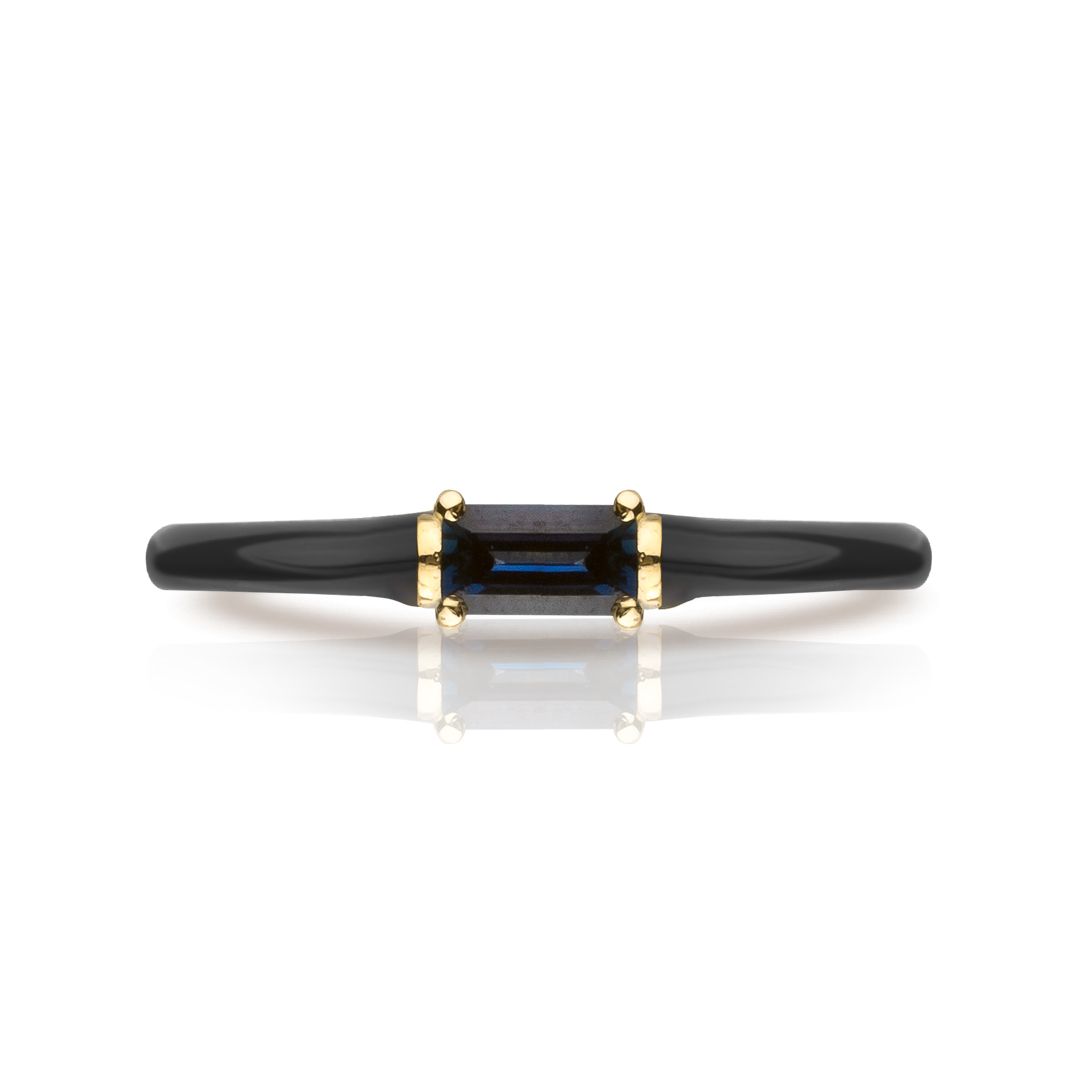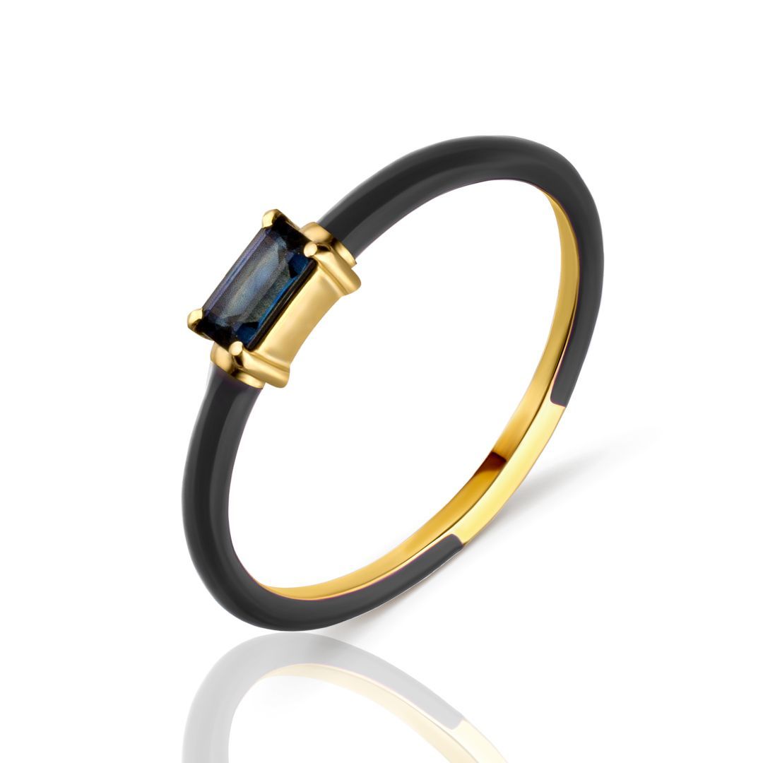 Синий сапфир, окруженный каскадом из серой эмали, становится центром внимания — этот драгоценный камень отражает неподдельную глубину ювелирного искусства.