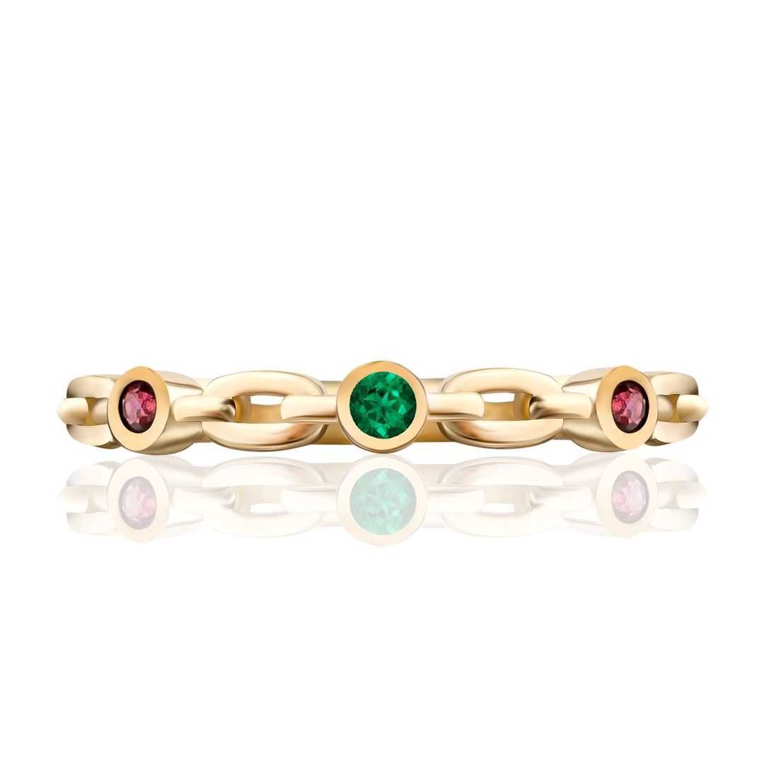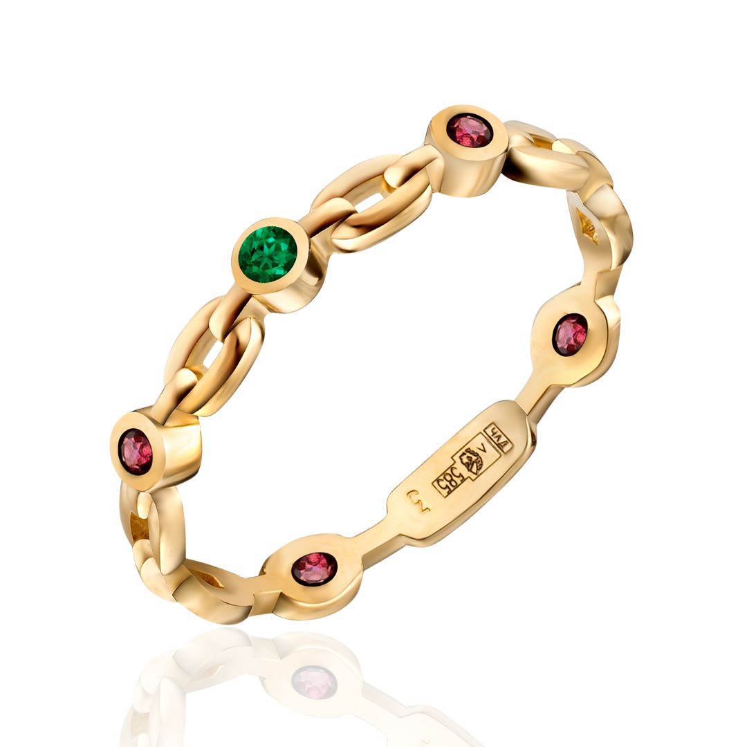 Кольцо из желтого золота с изумрудом, рубинами и бриллиантом
