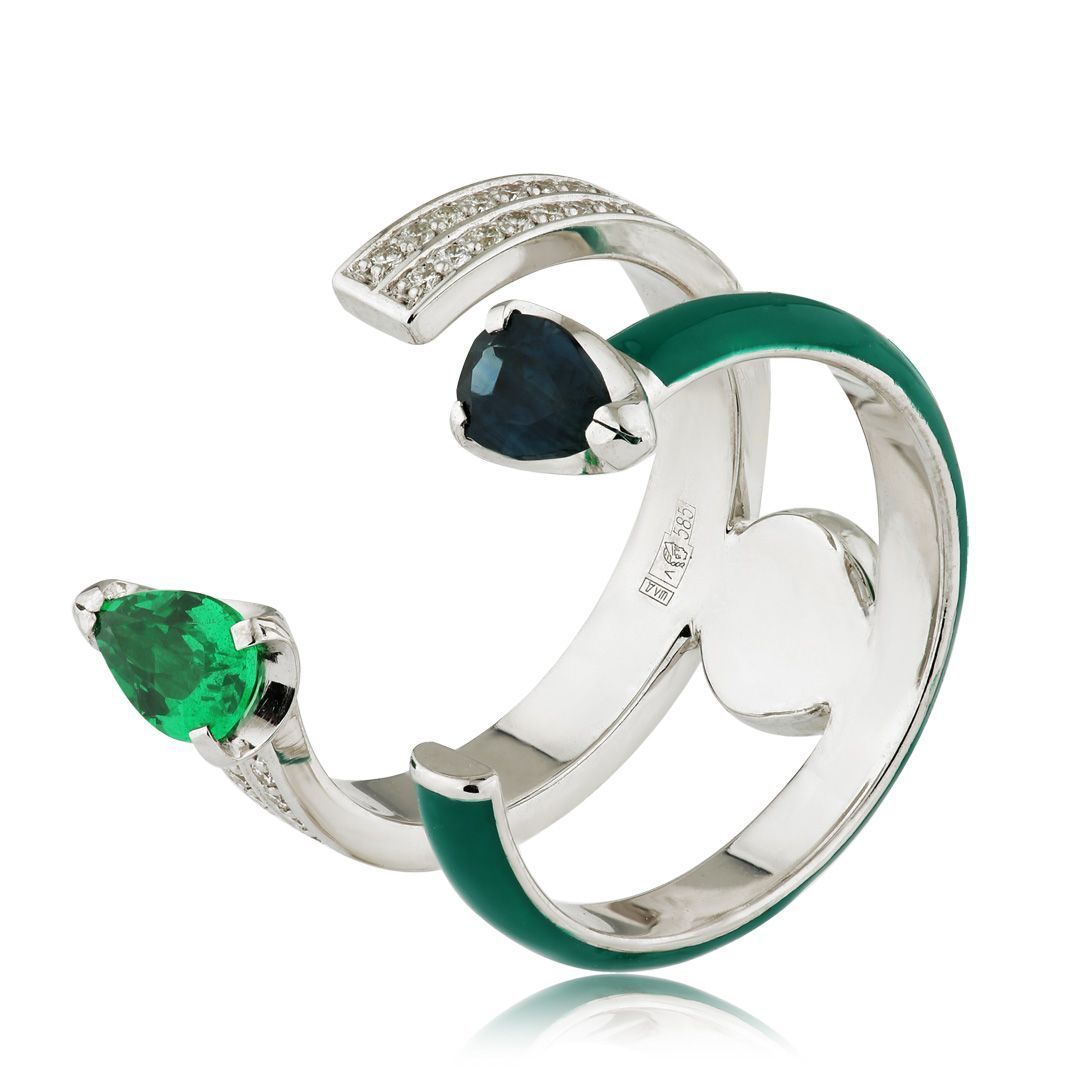 Двойное кольцо из белого золота словно двухъярусный сказочный торт. Одна часть – зеленая с изумрудной каплей, другая – усыпана яркими бриллиантами и гранатом. В коллекции CANDY неоновые цветовые сочетания эмали с самоцветами воплощают в себе искусство игры на контрастах, яркость color-block, и уникальную геометрию, которая придает каждому изделию бесподобный характер. Побалуйте себя гармоничным сочетанием драгоценного металла, яркой эмали и вневременного очарования бриллиантов.