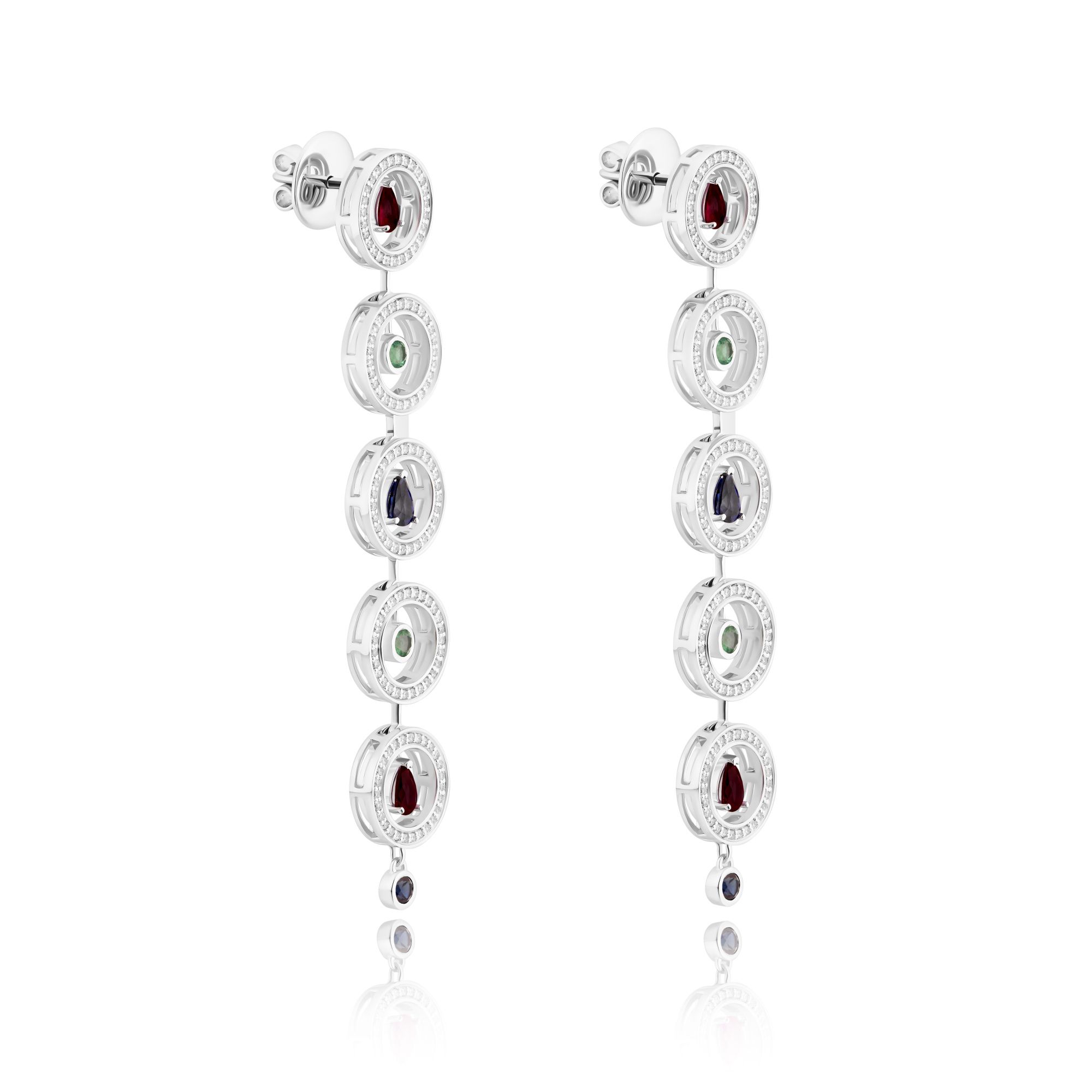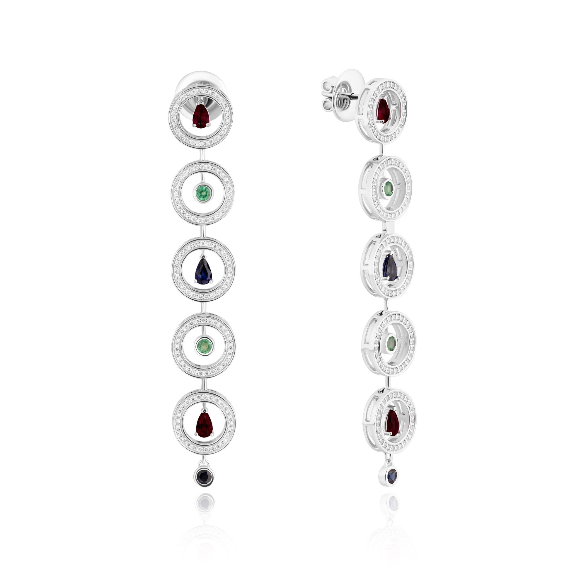 Пусеты из белого золота с изумрудами, сапфирами, рубинами и бриллиантами