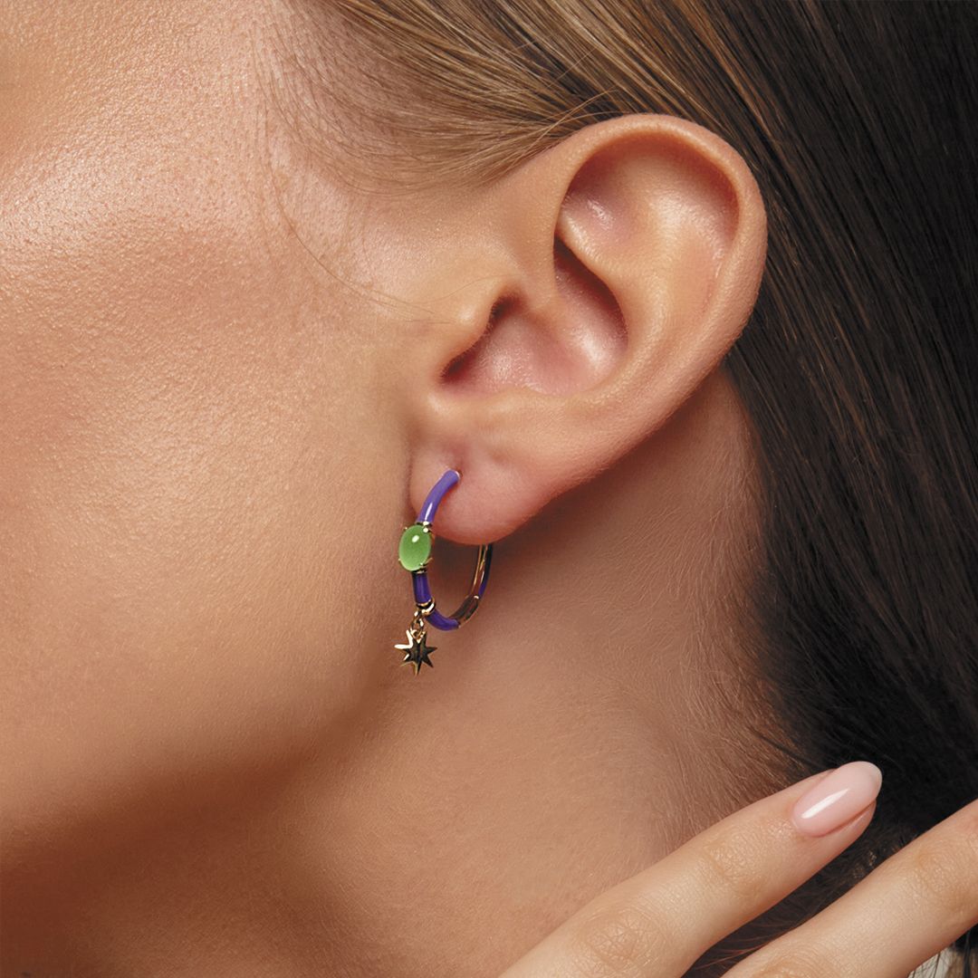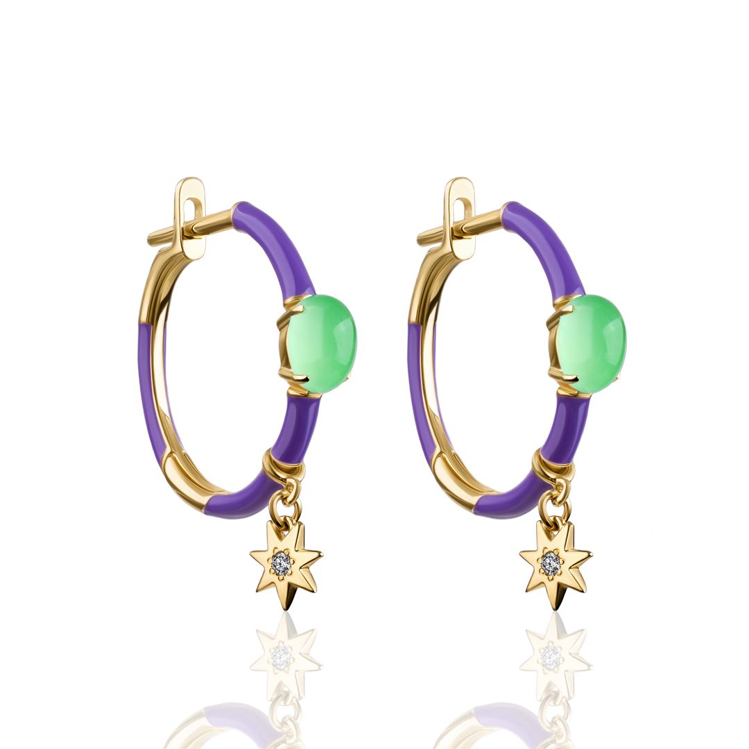 Представьте себя украшенными этими серьгами — завораживающим сочетанием желтого золота, фиолетовой эмали, хризопраза и изящных звезд, усыпанных бриллиантами. Эти маленькие звезды-подвески делают серьги по-настоящему очаровательными, а инкрустированные диаманты мерцают, будто далекие галактики. Каждый бриллиант — яркое напоминание о том, что вам, как и звездам на ночном небе, суждено сиять.