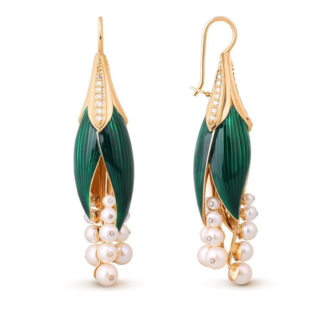 Серьги «Ландыши» из желтого золота с жемчугом и бриллиантами