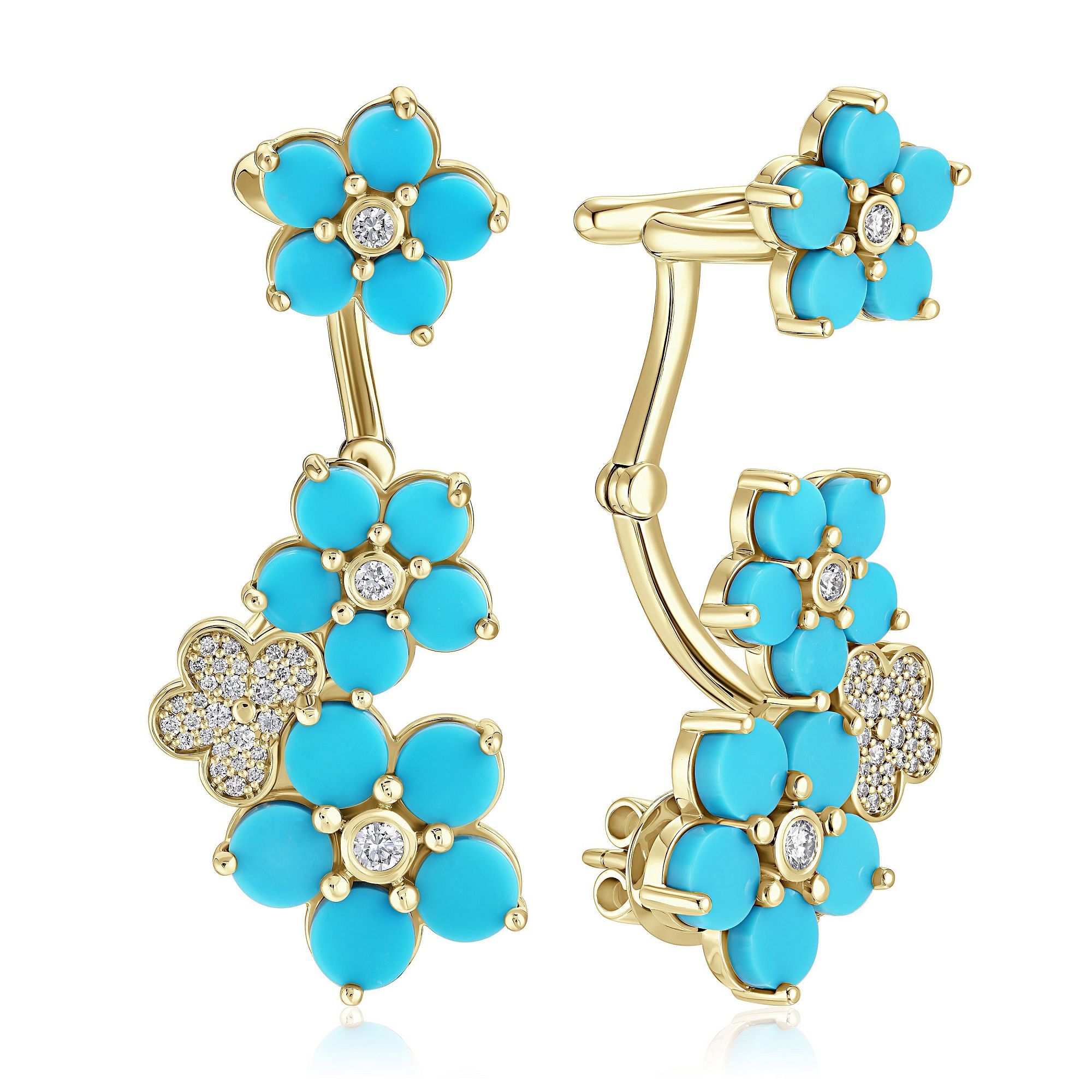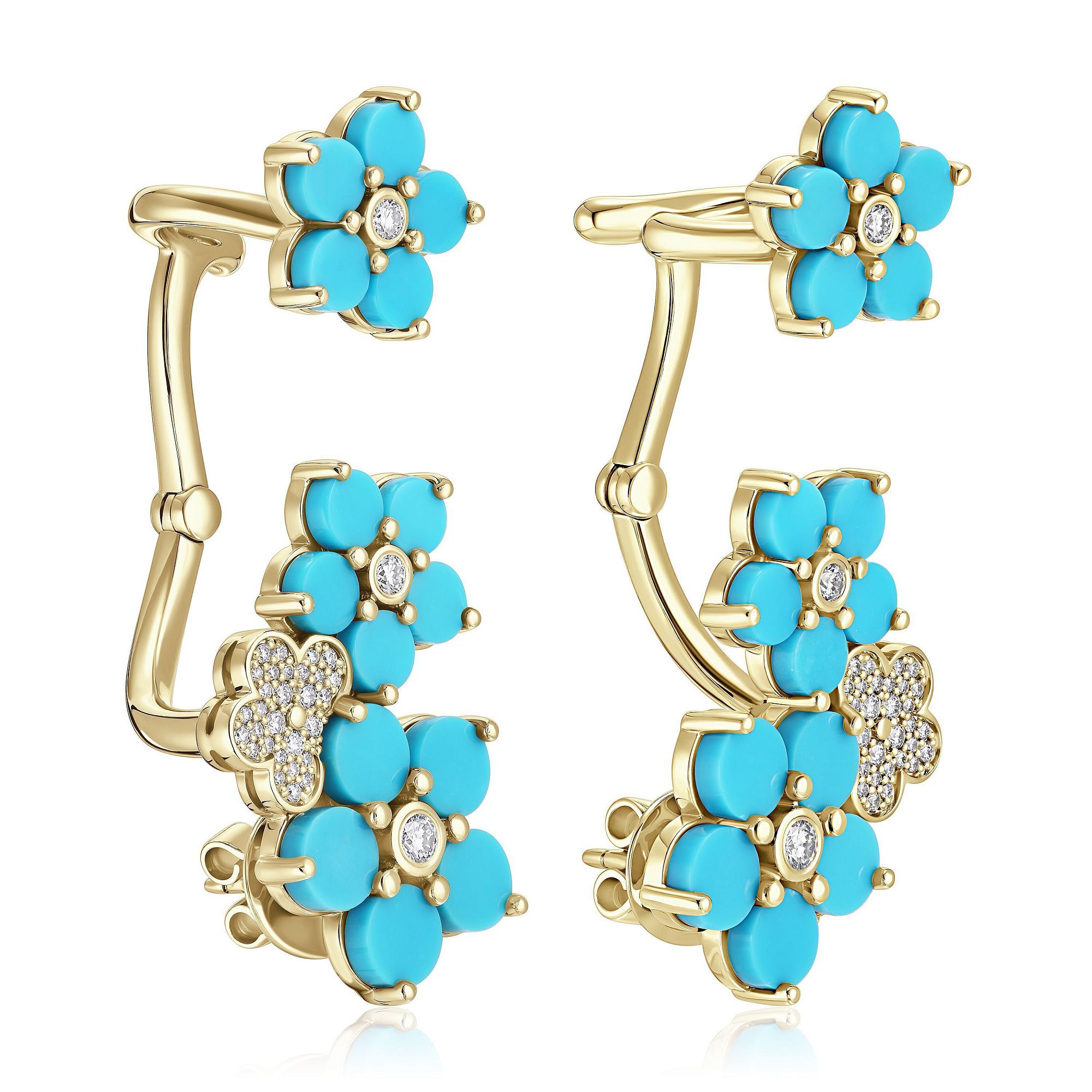 Серьги каффы из желтого золота с бирюзой и бриллиантами