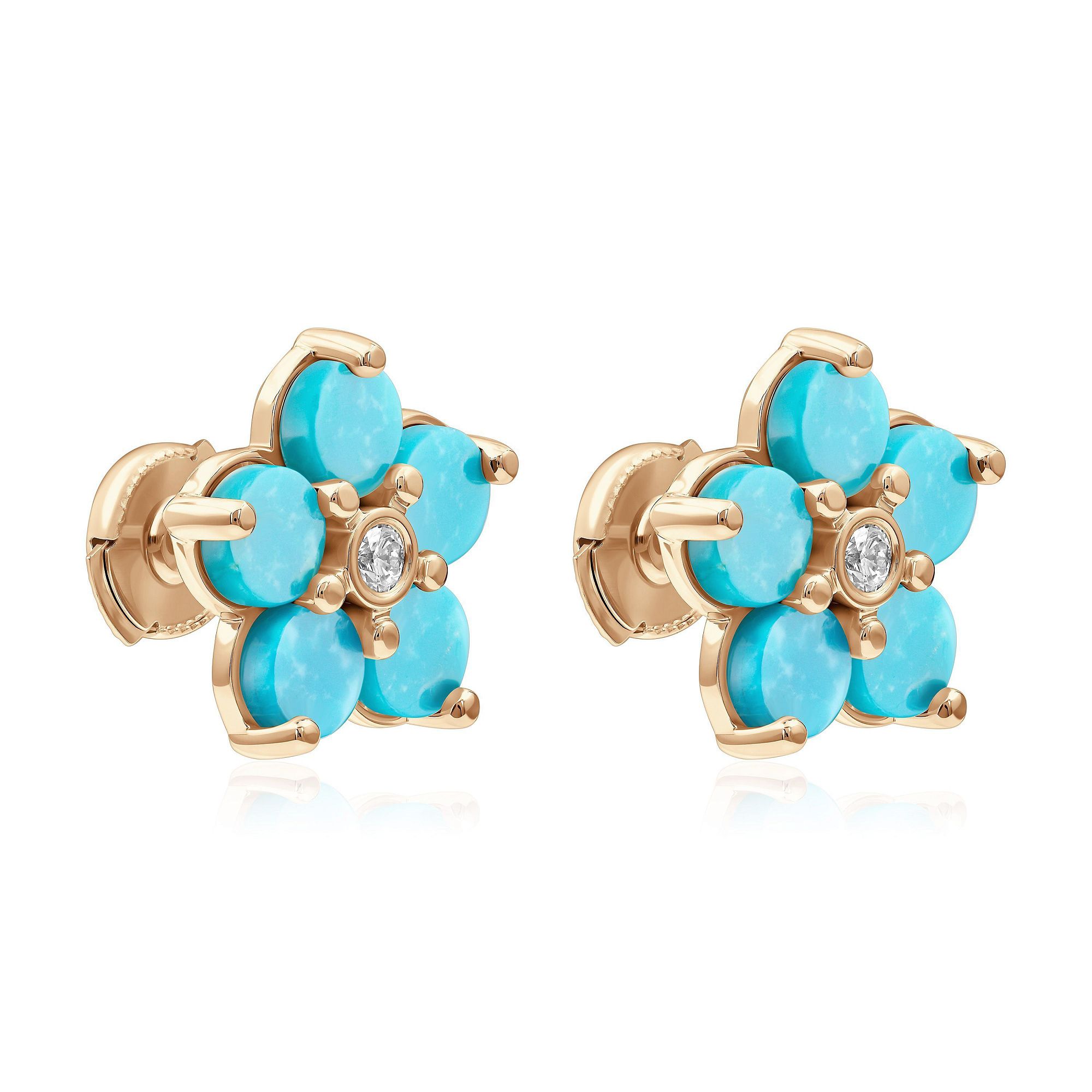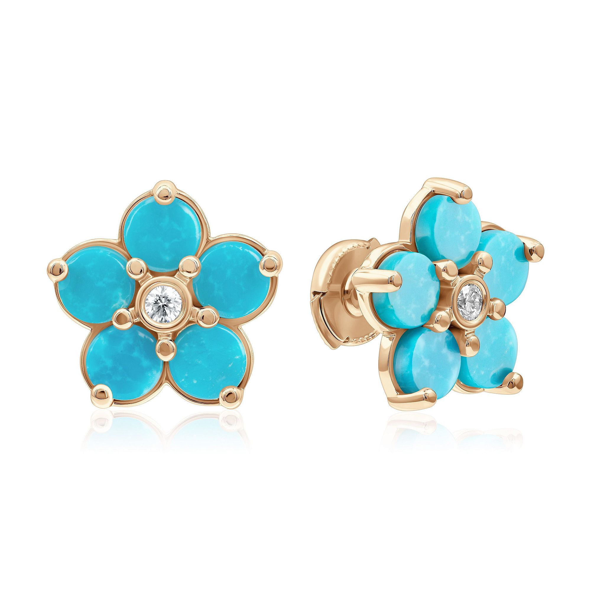 Пусеты из желтого золота с бирюзой и бриллиантами