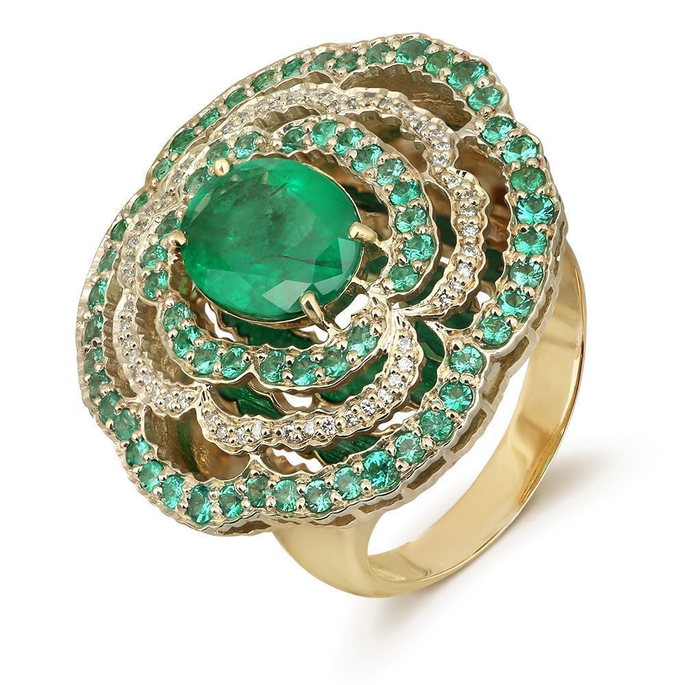 Кольцо «Медной горы хозяйка» из желтого золота с изумрудом 2.1 ct и бриллиантами