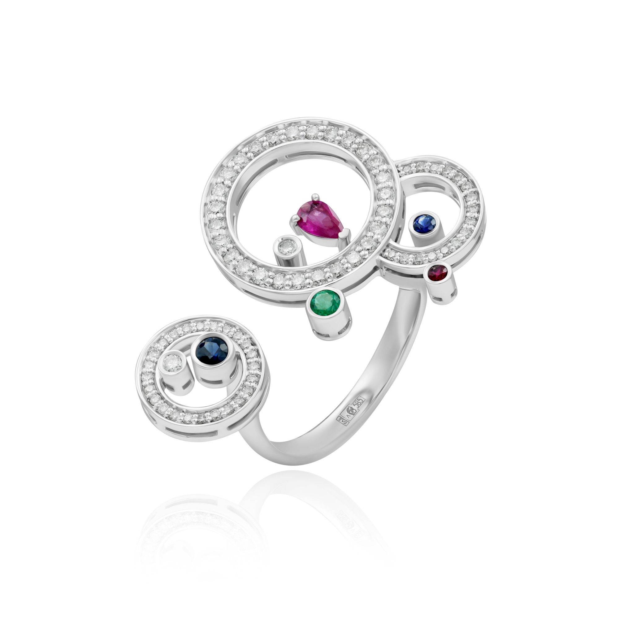 Кольцо из белого золота с изумрудом, сапфиром, бриллиантами и рубином