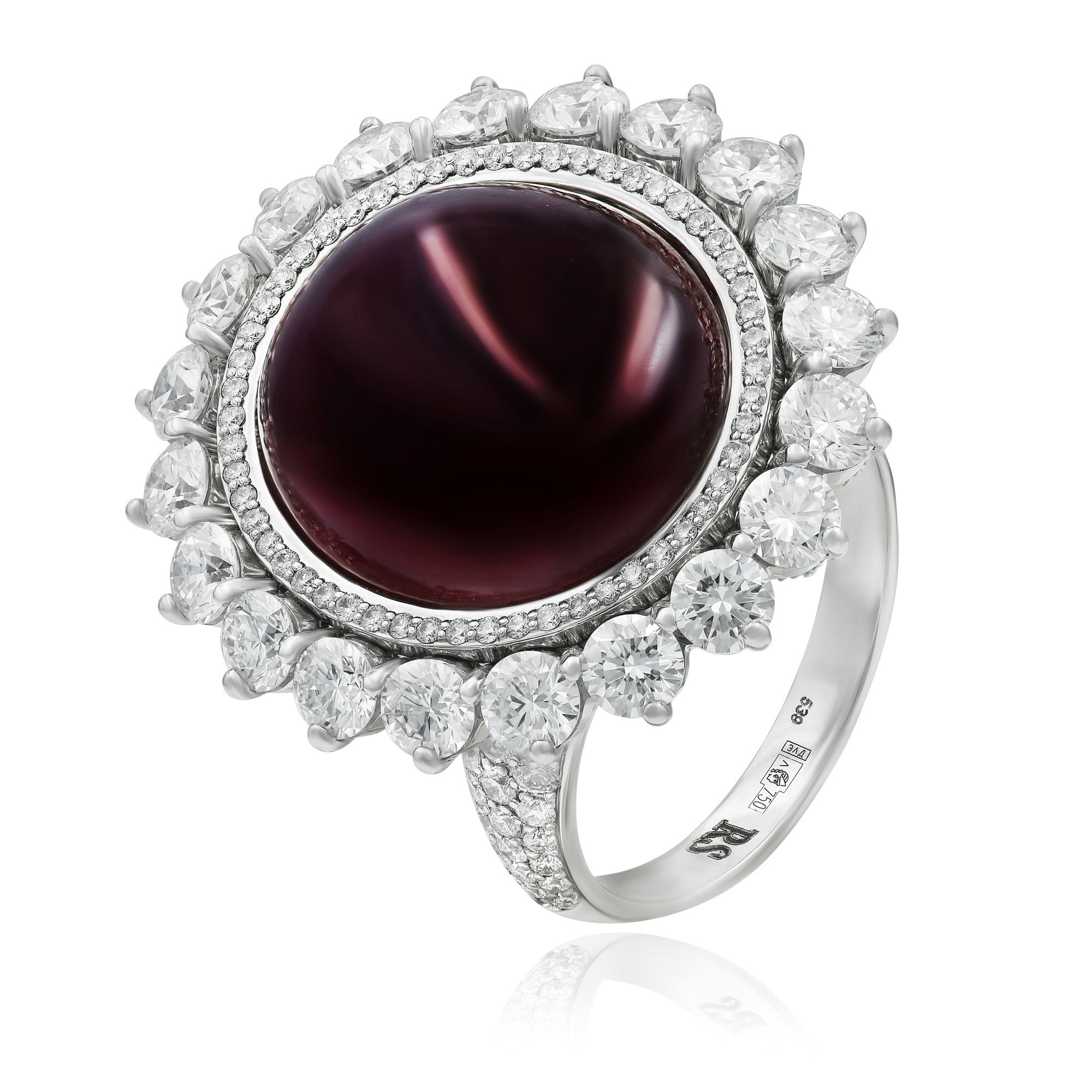 Изысканное кольцо из белого золота с необычным рубином. Редчайшее шелковое включение в драгоценном камне позволяет свету рассеиваться по поверхности рубина, освещая все грани минерала. Расположенные по окружности бриллианты лишь усиливают блеск, создавая неповторимую игру света.
