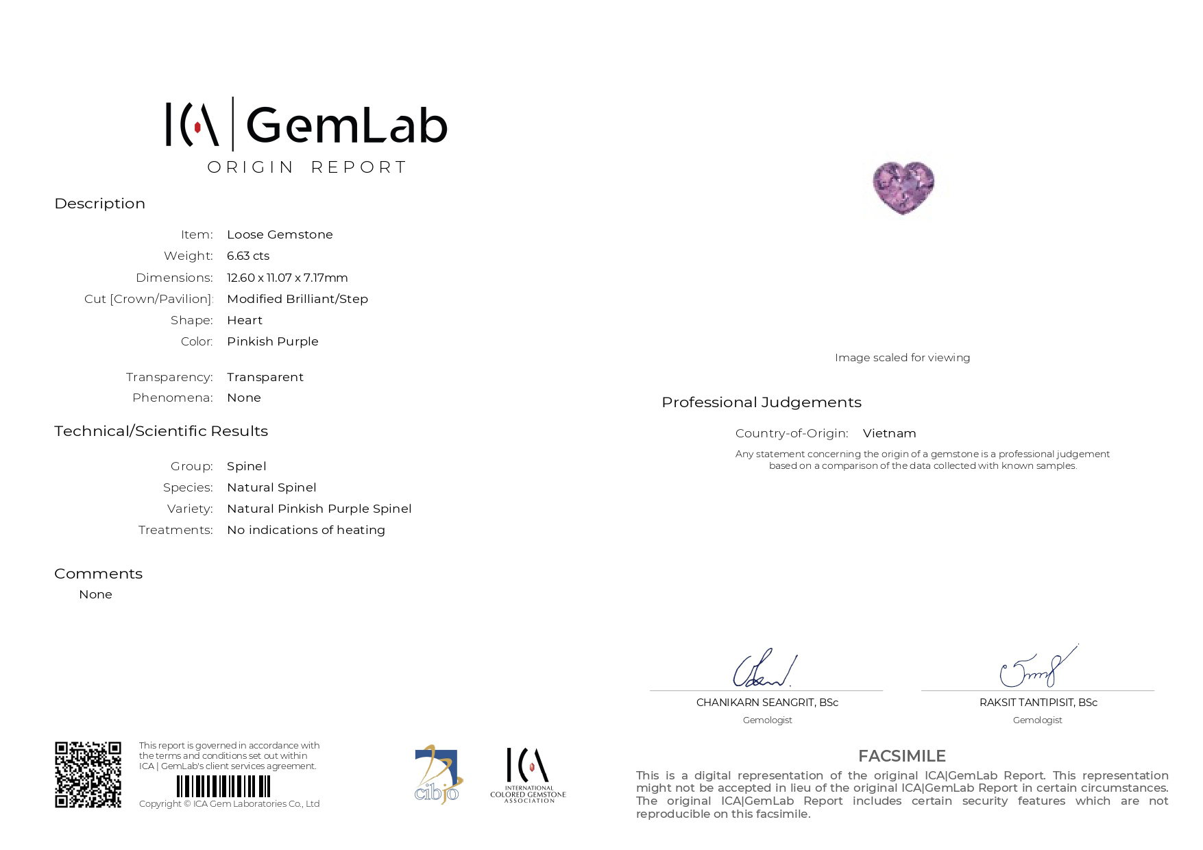 - Шпинель - Количество: 1, Форма: «Сердце», Вес: 6.630 ct.