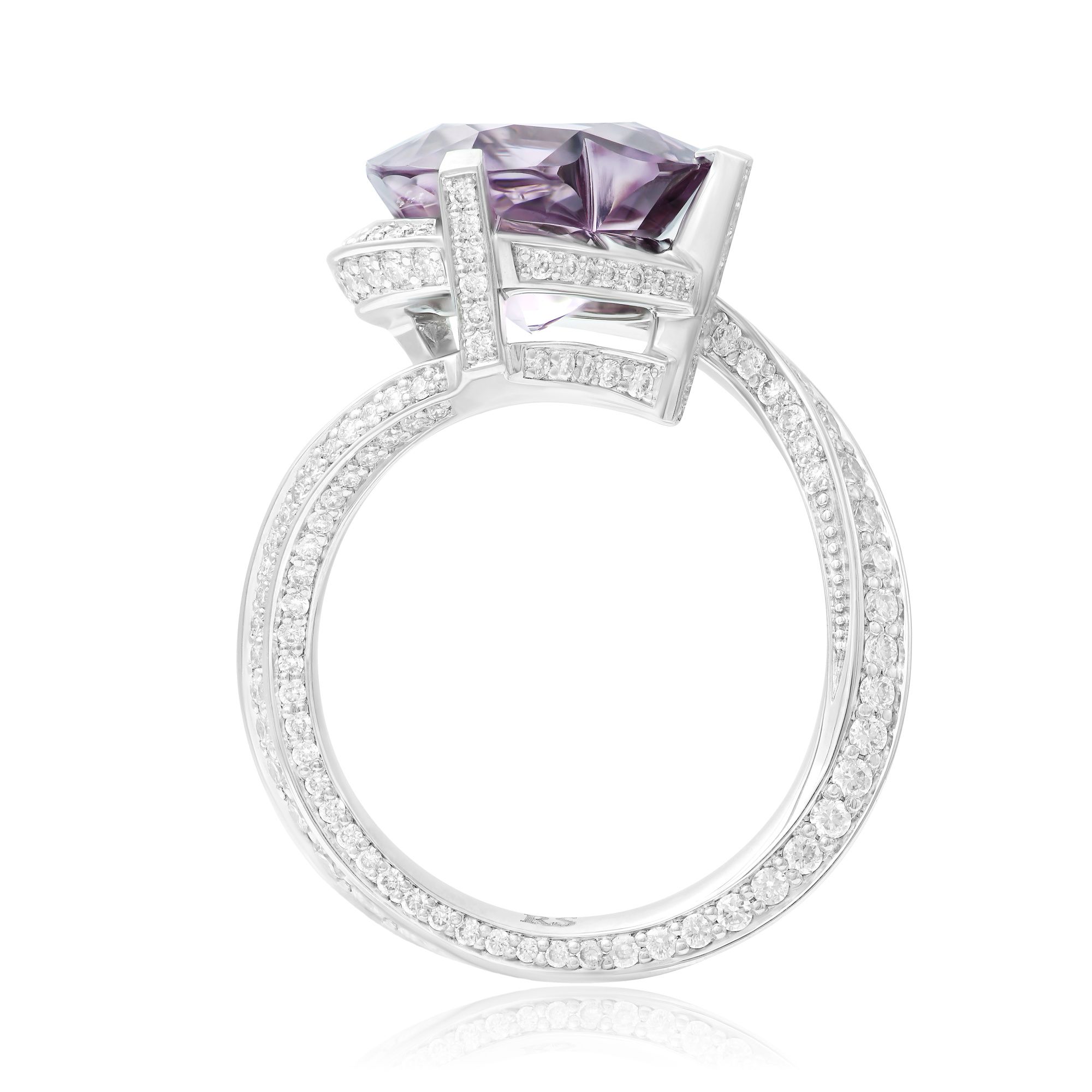 Кольцо из белого золота со шпинелью и бриллиантами – ода любви. Фиолетовый минерал в форме сердца, словно чувства, переполняющие любящую душу. Витиеватое исполнение кольца – символ непредсказуемости судьбы.