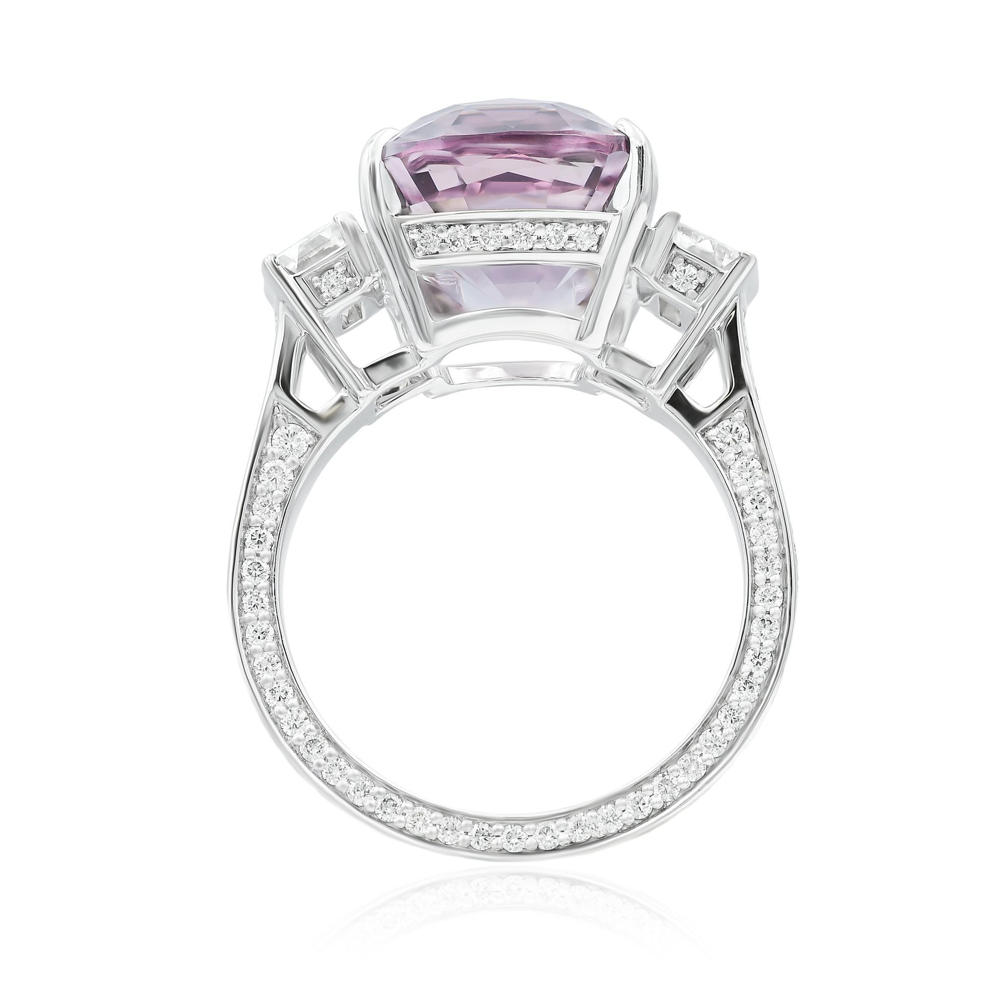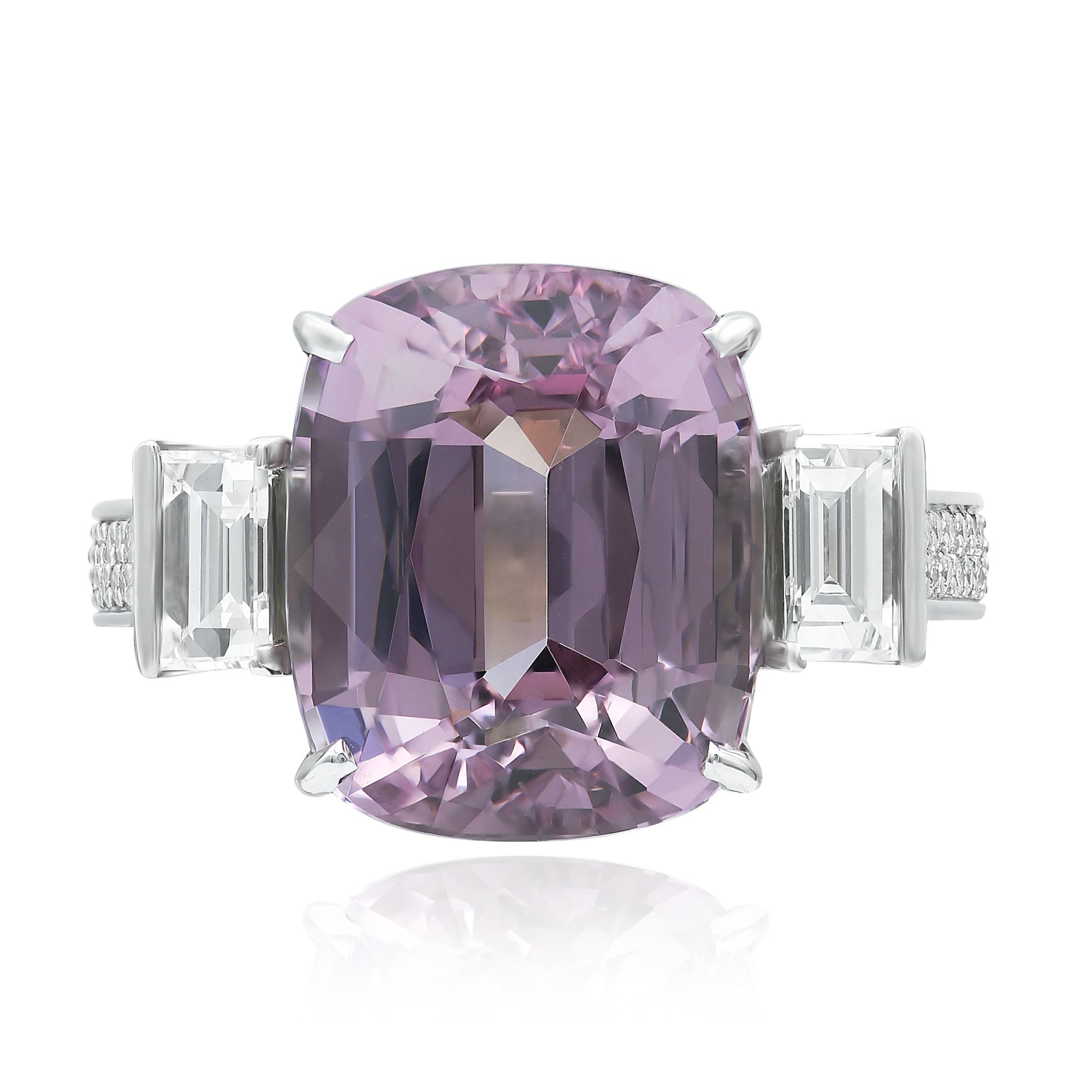 Исключительный дизайн, который никого не оставит равнодушным. Бриллианты, обрамляющие сиреневую шпинель, искрятся чистотой и блеском. Их переливы дополняют красоту шпинели, создавая завораживающий контраст.