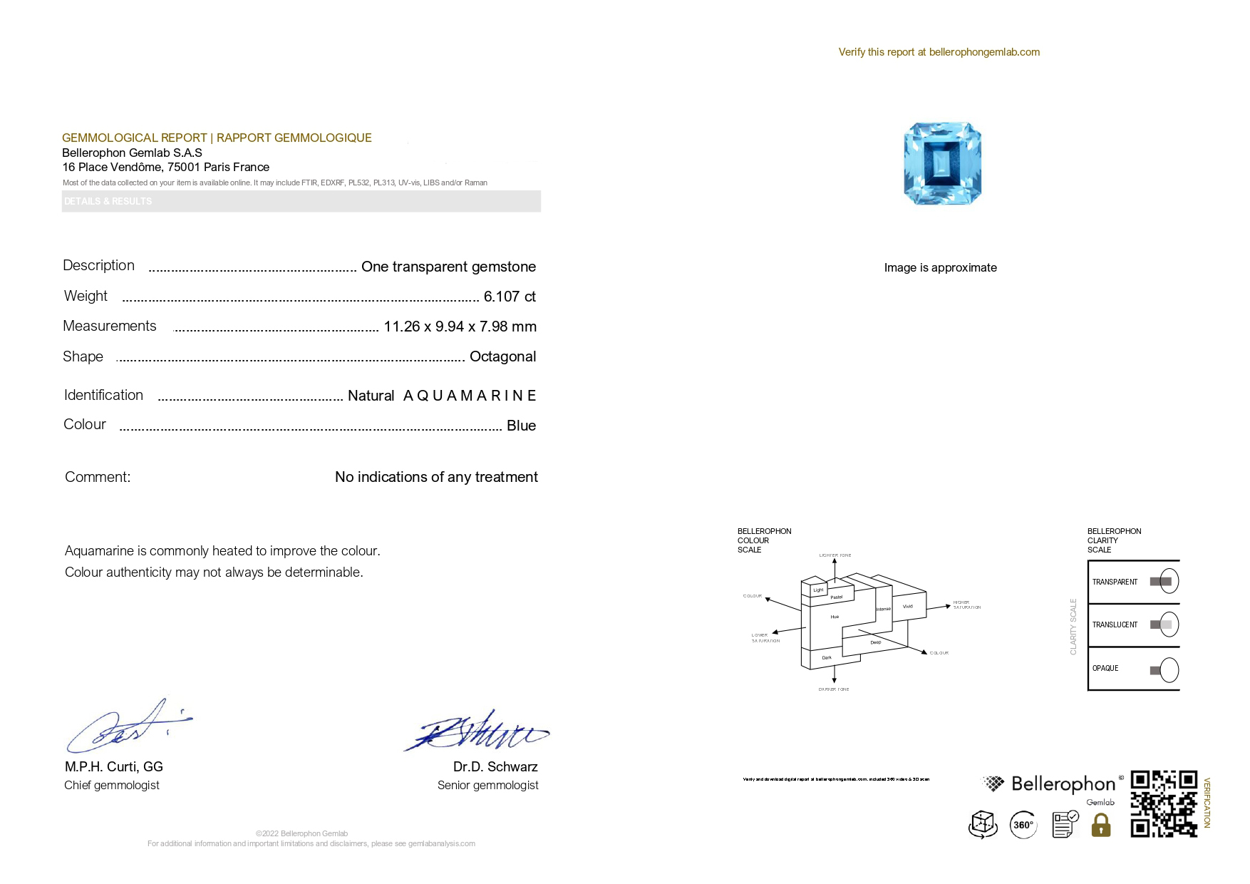 - Аквамарин - Количество: 1, Форма: «Октагон», Вес: 6.100 ct.