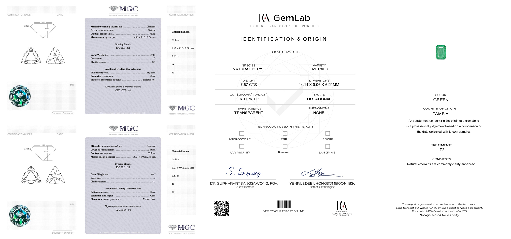 - Изумруд - Количество: 1, Форма: «Октагон», Вес: 7.570 ct.