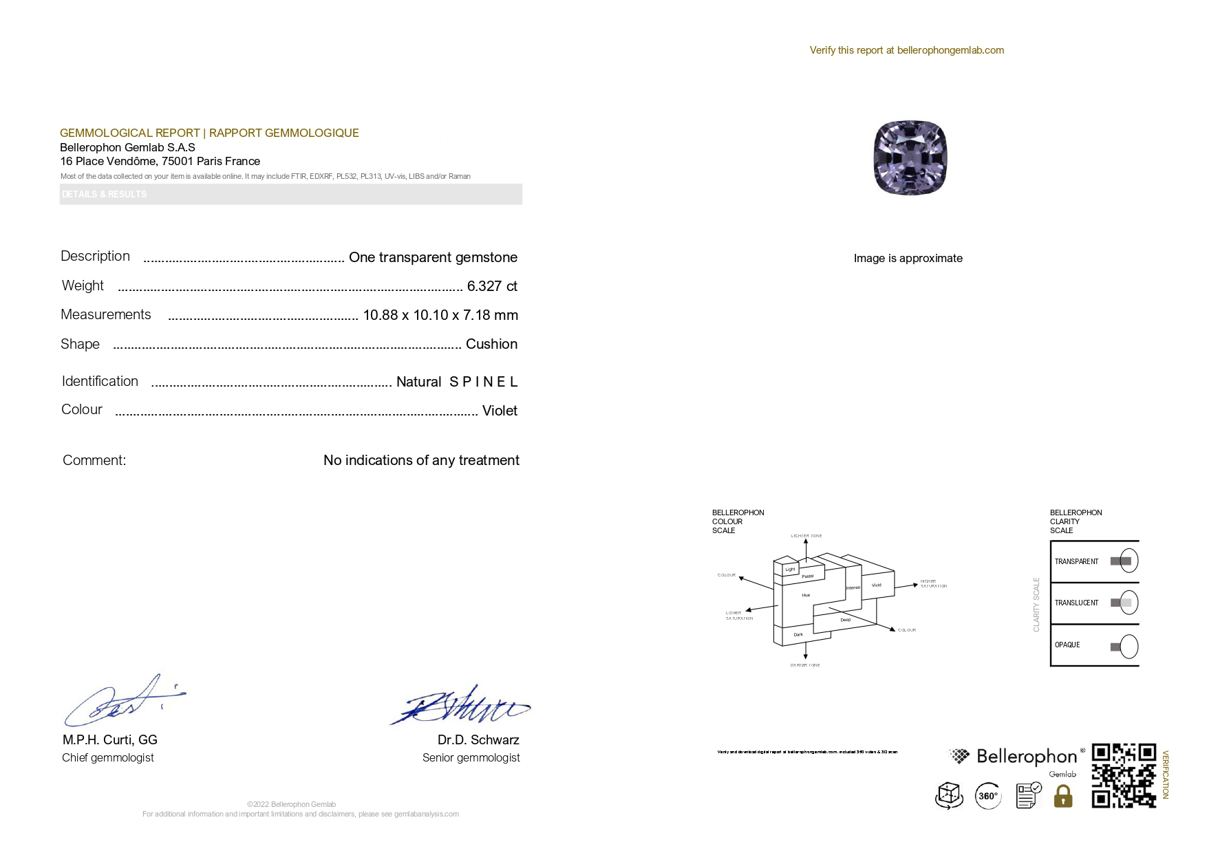 - Шпинель - Количество: 1, Форма: «Кушон», Вес: 6.320 ct.