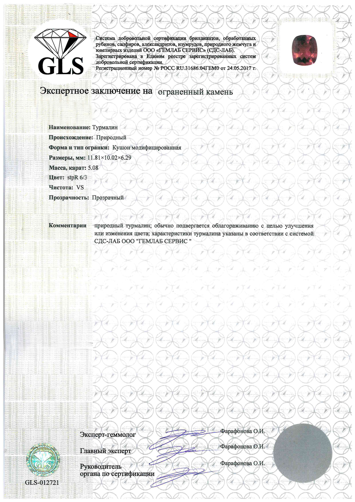 - Турмалин - Количество: 1, Форма: «Кушон», Вес: 5.080 ct.