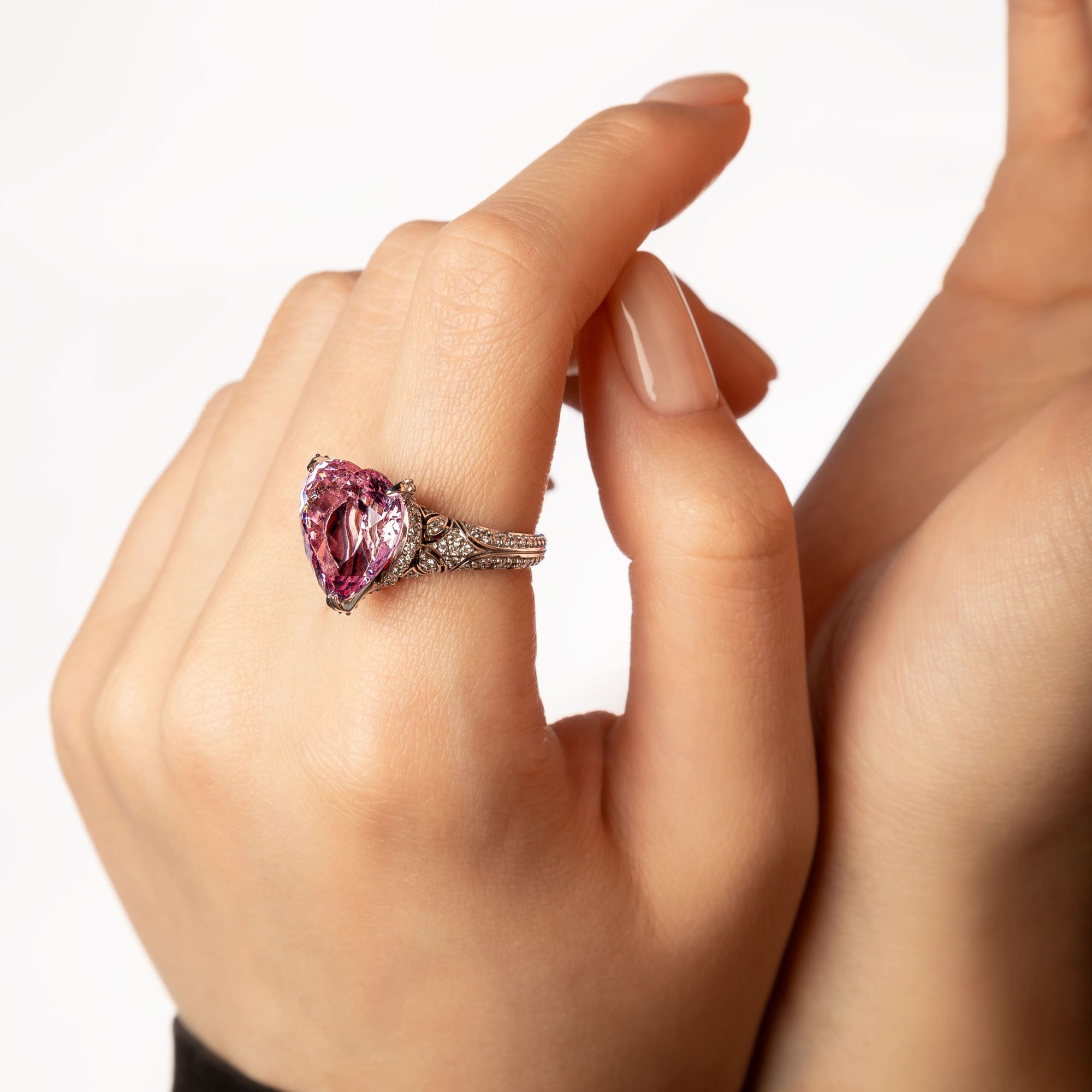 Изысканное кольцо, в центре внимания которого сердце, выполненное из розового морганита. Сильная энергетика камня помогает справиться со стрессом и выйти победителем из сложной ситуации. Исключительный дизайн станет идеальным дополнением к любому образу.