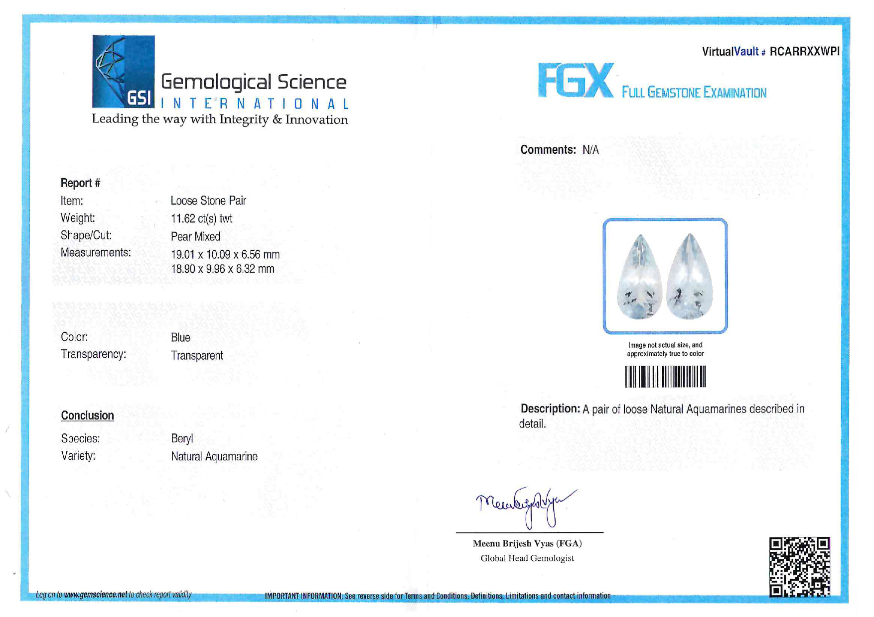 - Аквамарин - Количество: 2, Форма: «Груша», Вес: 11.620 ct.