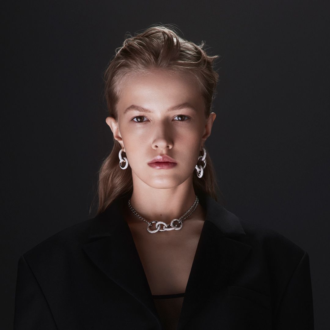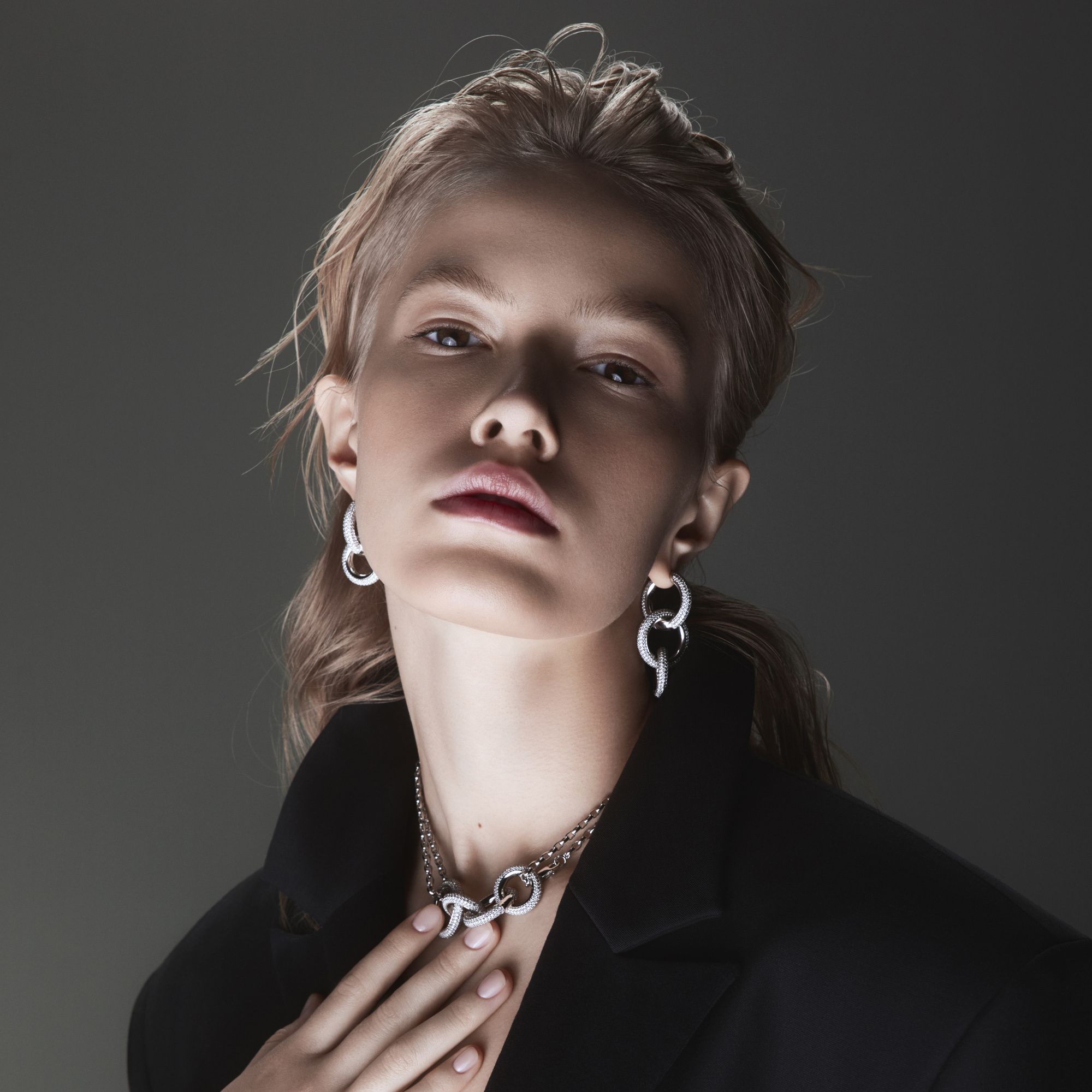 В коллекции CHAIN культовая эстетика белого золота и бриллиантовой обсыпки с уникальной закрепкой «паве» вступает в диалог с непокорным, дерзким и смелым духом street fashion. Грубые звенья модного тренда переписывают правила дизайна утонченных ювелирных украшений.