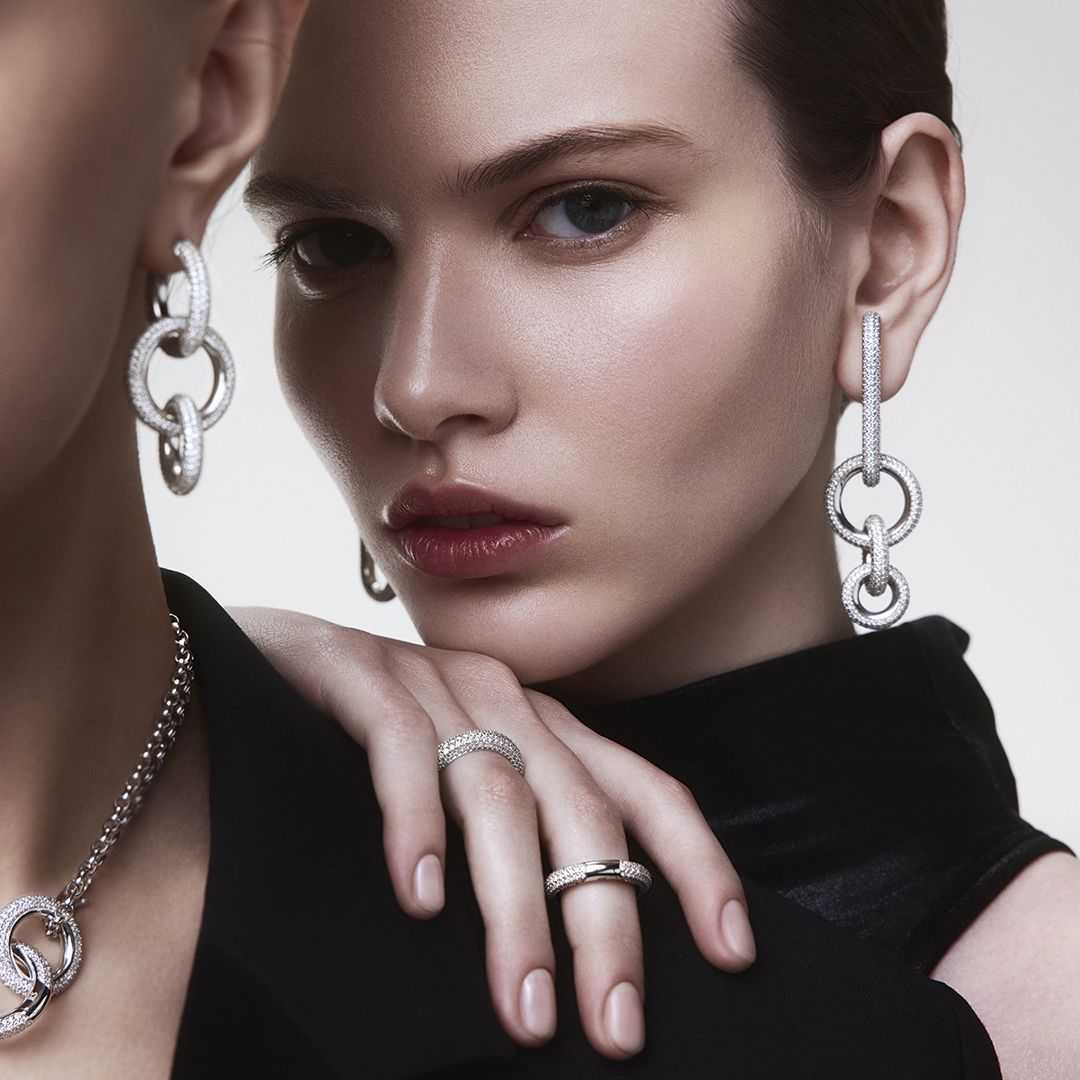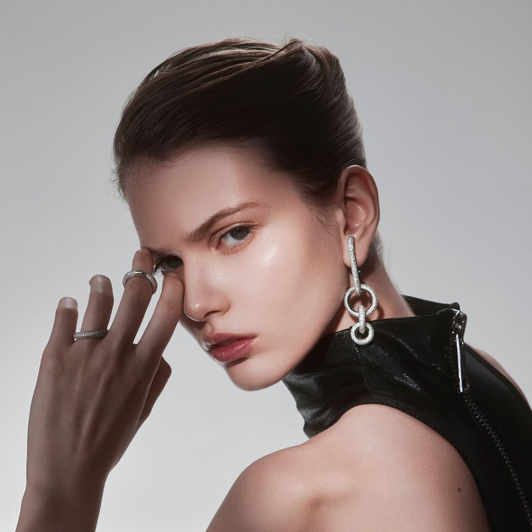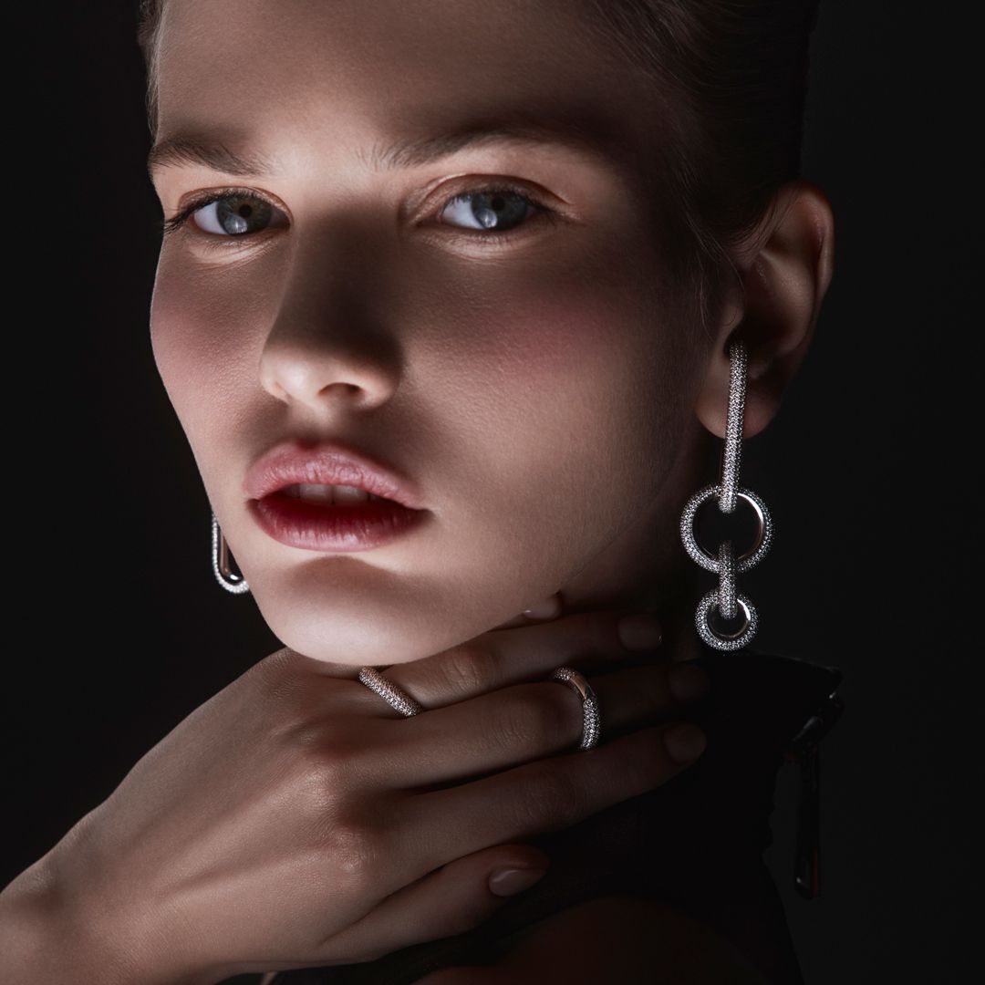 В коллекции CHAIN культовая эстетика белого золота и бриллиантовой обсыпки с уникальной закрепкой «паве» вступает в диалог с непокорным, дерзким и смелым духом street fashion. Грубые звенья модного тренда переписывают правила дизайна утонченных ювелирных украшений.