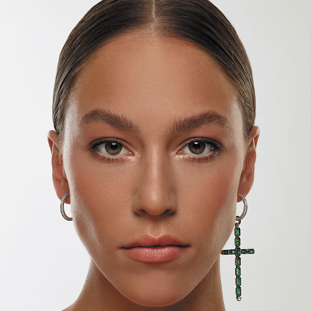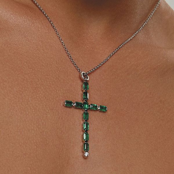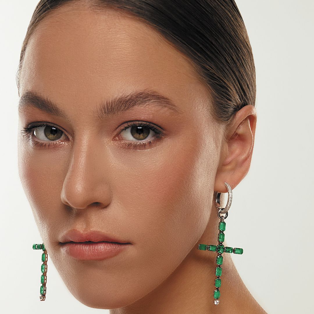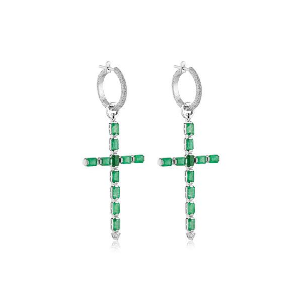 Серьги-кресты из белого золота с изумрудами и бриллиантами