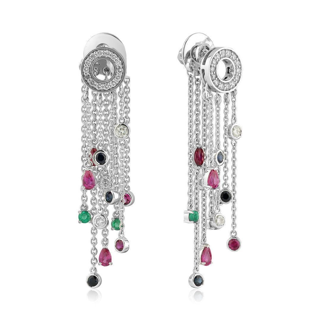 Пусеты из белого золота с изумрудами, рубинами, сапфирами и бриллиантами