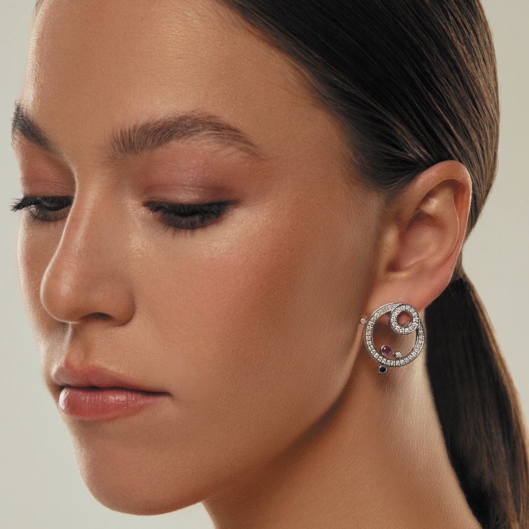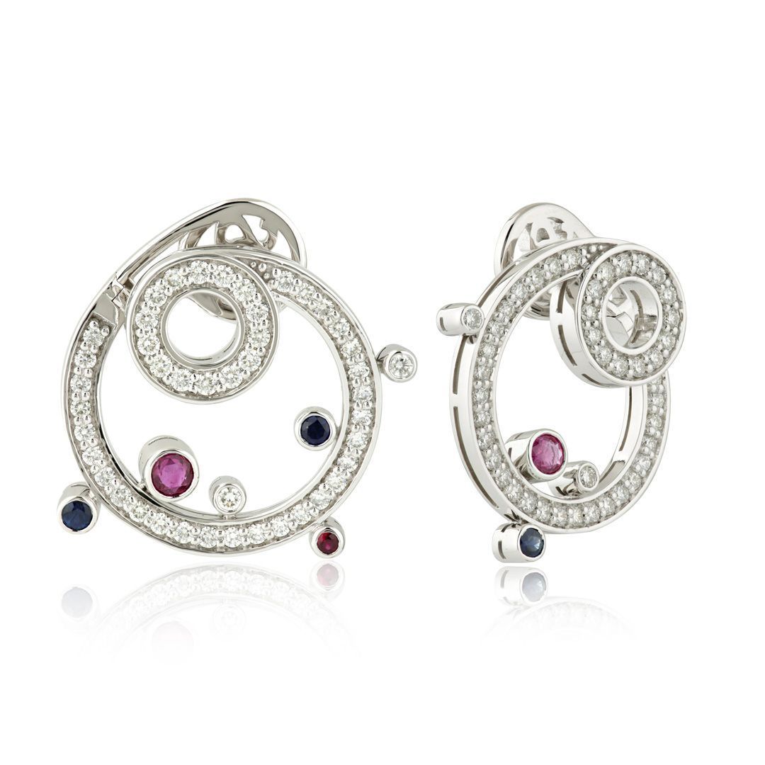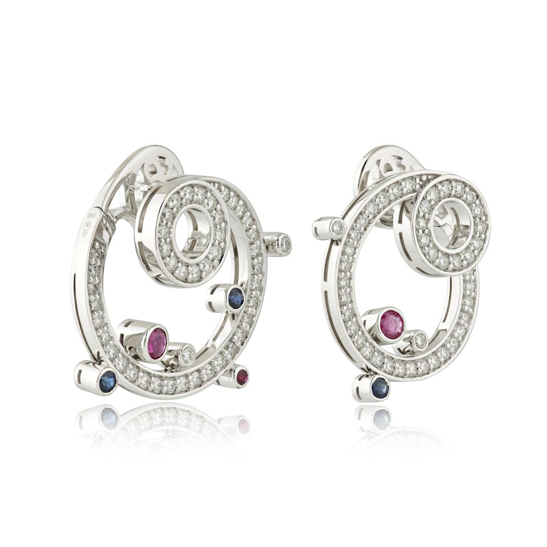 Пусеты из белого золота с рубинами, сапфирами и бриллиантами